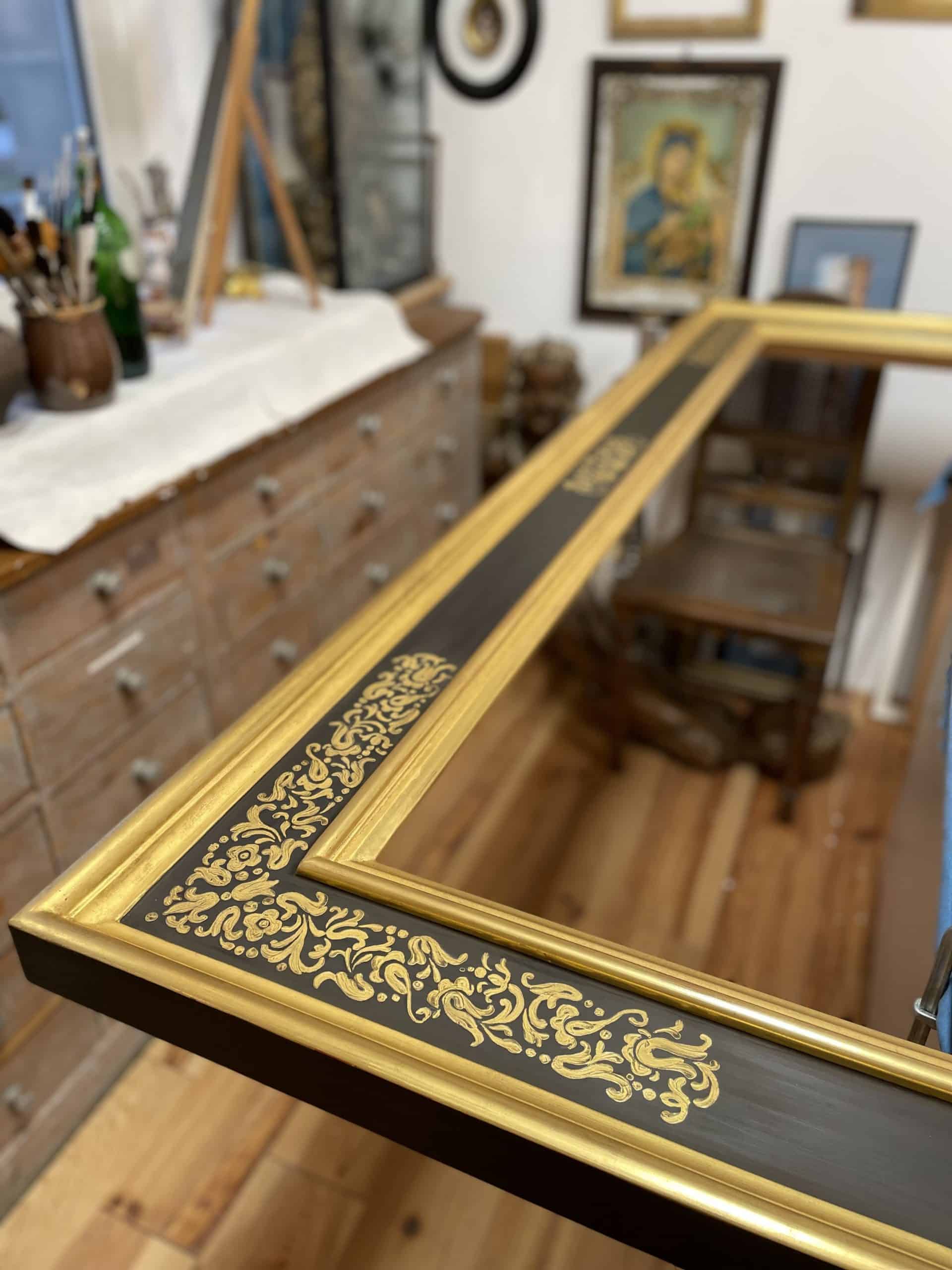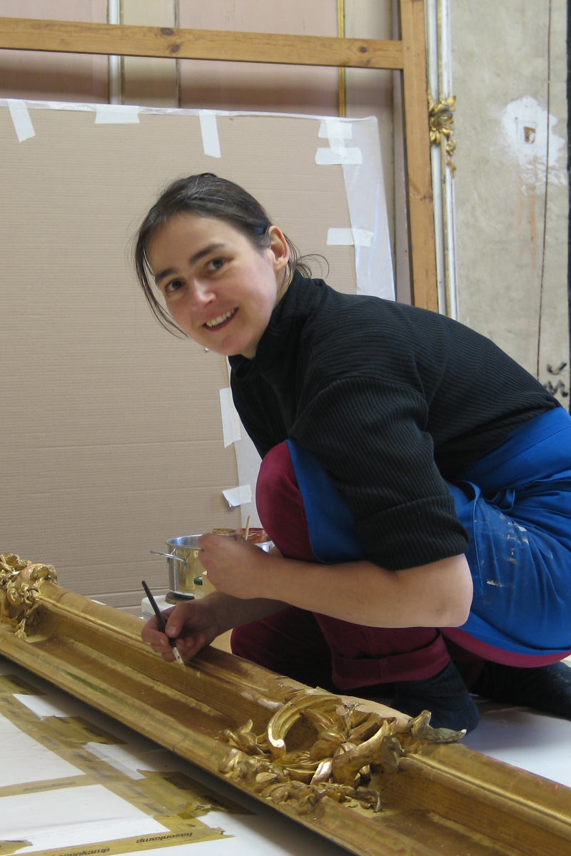 Wer Alexia Falk einen Blick über die Schulter wirft kann beobachten, wie sie Kreide in warmes Wasser mit Knochenleim einsumpft um daraus eine geschmeidige Knetmasse zu rühren, warme Kreidegründe mit dem Pinsel aufträgt, mit geübter Hand Zierschnitte in dicke Kreideschichten zieht, wie mit schneller Hand Blattgold auf nassem Untergrund „angeschossen“ wird oder wie der Achatpolierstein krachend über zarte Perlestäbe rattert und das Blattgold zum glänzen bringt. So entstehen Neuanfertigungen von Bilderrahmen und gefassten Objekten aber auch Rekonstruktionen nach historischer Vorlagen.