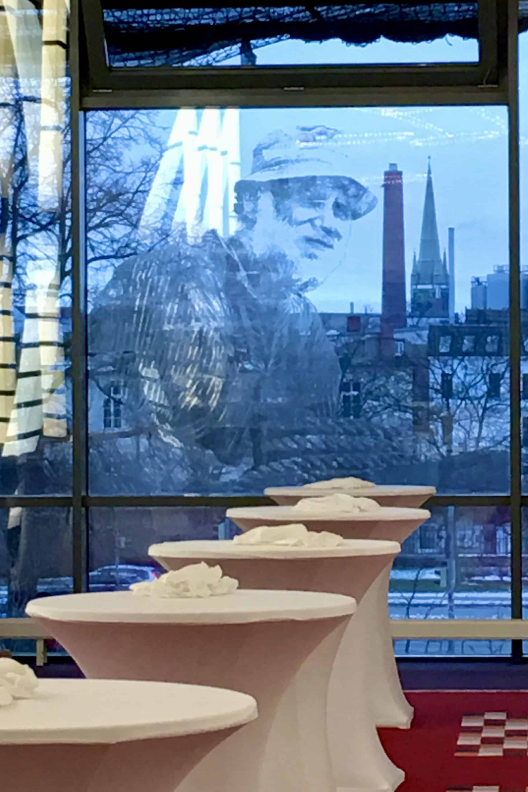 Durch Überlagerung von mehreren Glasschichten entsteht eine Dreidimensionalität, wie sie zum Beispiel in einem Pop Up-Buch verwendet wird. Die Überlappung der Zeiten und geschichtlicher Ereignisse, die nicht verleugnenden Zusammenhänge der Vergangenheit, Gegenwart und Zukunft sind inhaltlich eng mit der Materialauswahl verbunden.