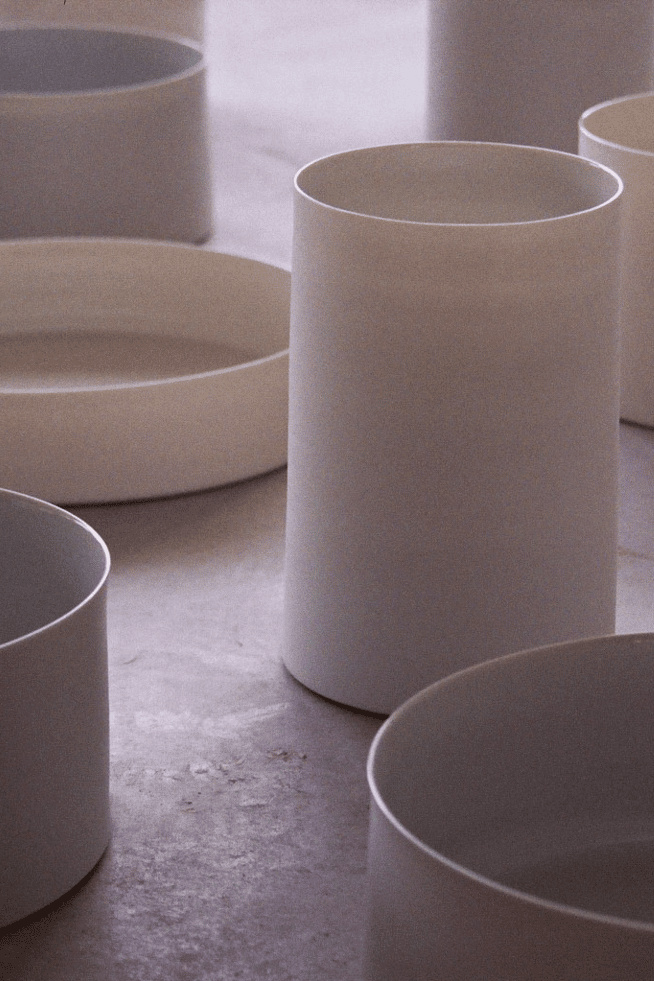Ihre handgedrehten Porzellangefäße bringen auf diese Weise Fragen zur Form und Philosophie des Gefäßes in den Alltag.