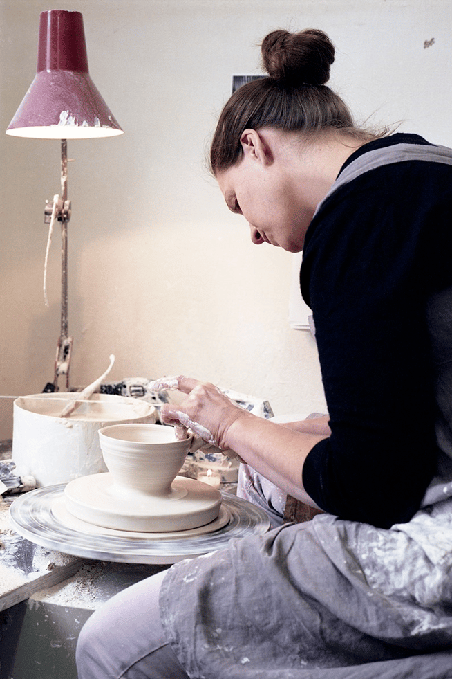 Die Porzellangefäße, meist Zylinder, aus französischem Hartporzellan entstehen in vielen Arbeitsschritten auf der Töpferscheibe. Innen werden sie transparent glasiert, außen nach dem Brand von Hand geschliffen.