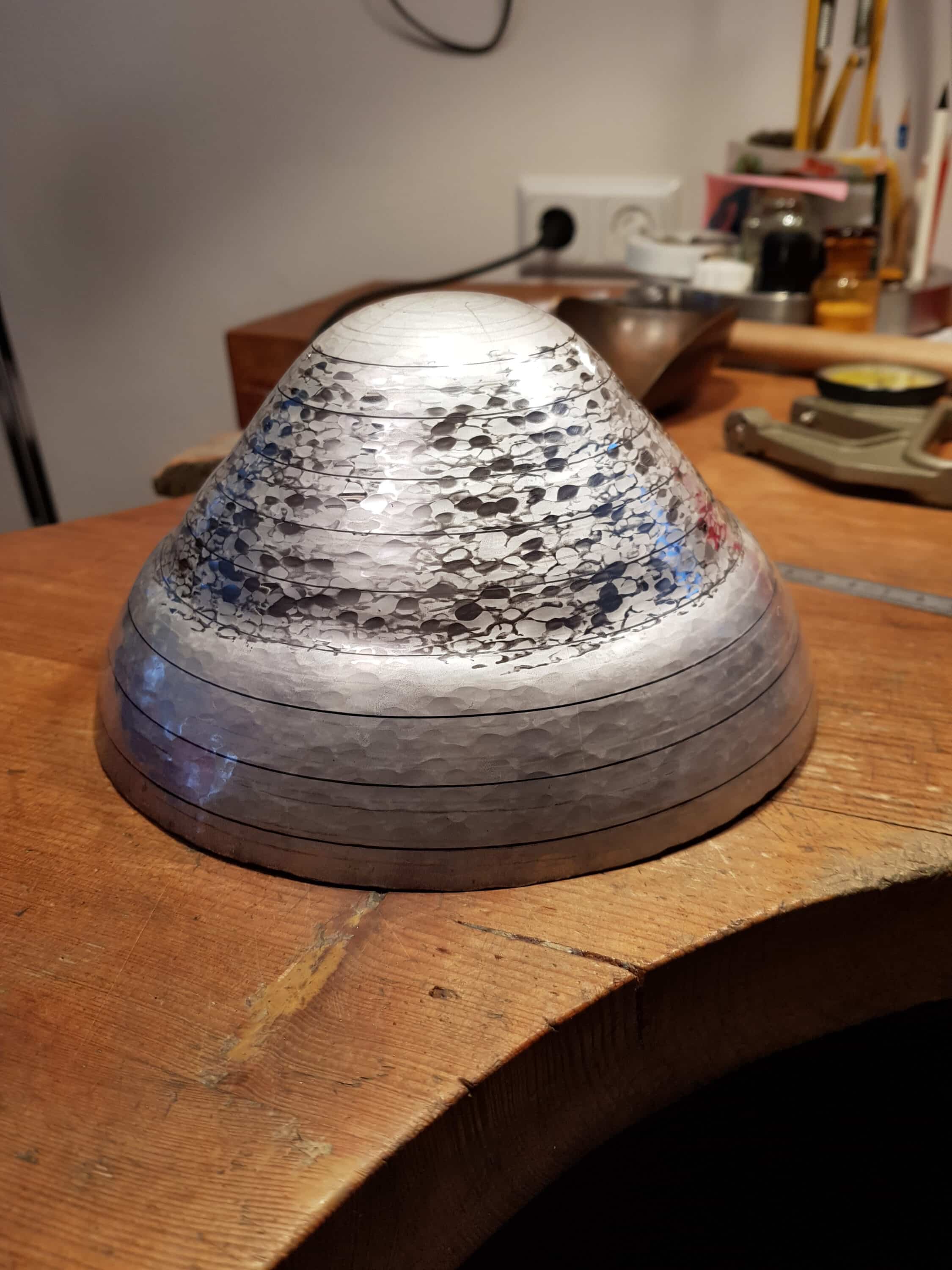 Während der Entwurfsarbeit bedient sich die Goldschmiedin sowohl traditioneller, als auch moderner Techniken. So können mittels 3D-Programm z.B. Proportion und Wirkung von Gefäßen aus unterschiedlichen Perspektiven betrachtet, Volumina und Materialmengen sehr genau voraus berechnet werden. Desweiteren können Abwicklungen und Schablonen für die Arbeit am Werkbrett erstellt werden.