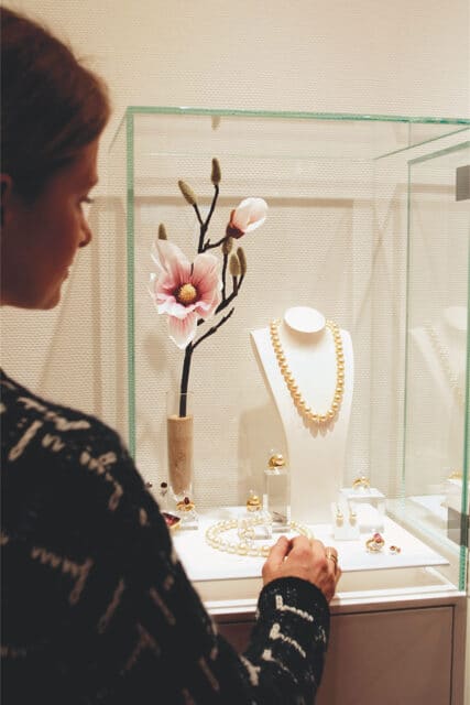 Kaum zu glauben, dass all diese Schmuckstücke in Handarbeit entstanden sein sollen. Doch betritt man den Laden, wird man aus dem ersten Stock von den handwerklichen Geräuschen, die das Arbeiten in einer Goldschmiedewerkstatt mit sich bringt, begrüßt. Hier wird gesägt, gefeilt, gehämmert, gelötet. Nach traditionell erlernter Handwerkskunst aber auch mit dem Einsatz neuer technischer Geräte und Hilfsmittel, entstehen hier all die Schmuckstücke, welche später die Schaufenster der Goldschmiede füllen.
