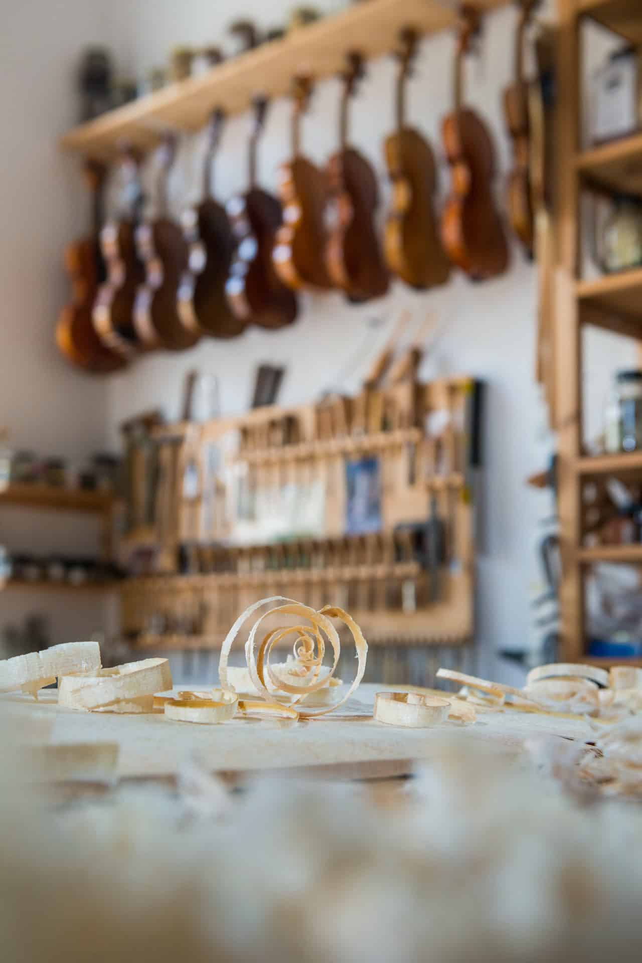 Handwerker bearbeitet Holz mit einem Hobel in einer hellen Werkstatt, umgeben von Holzspänen und Musikinstrumenten.
