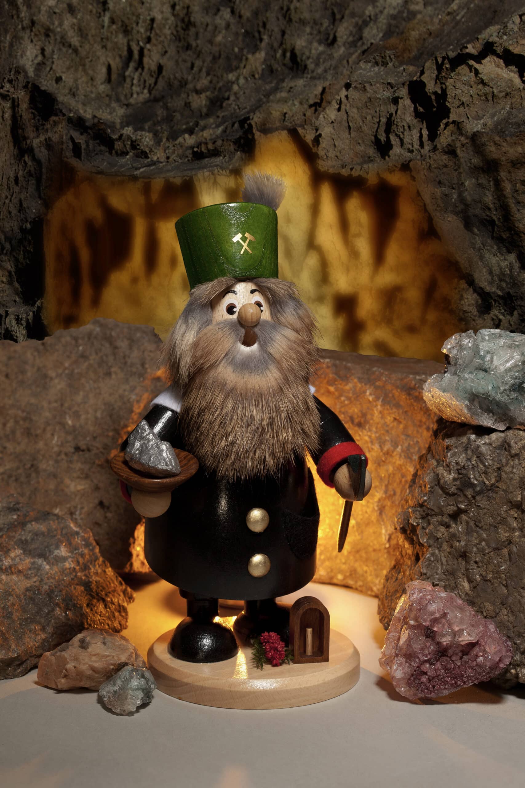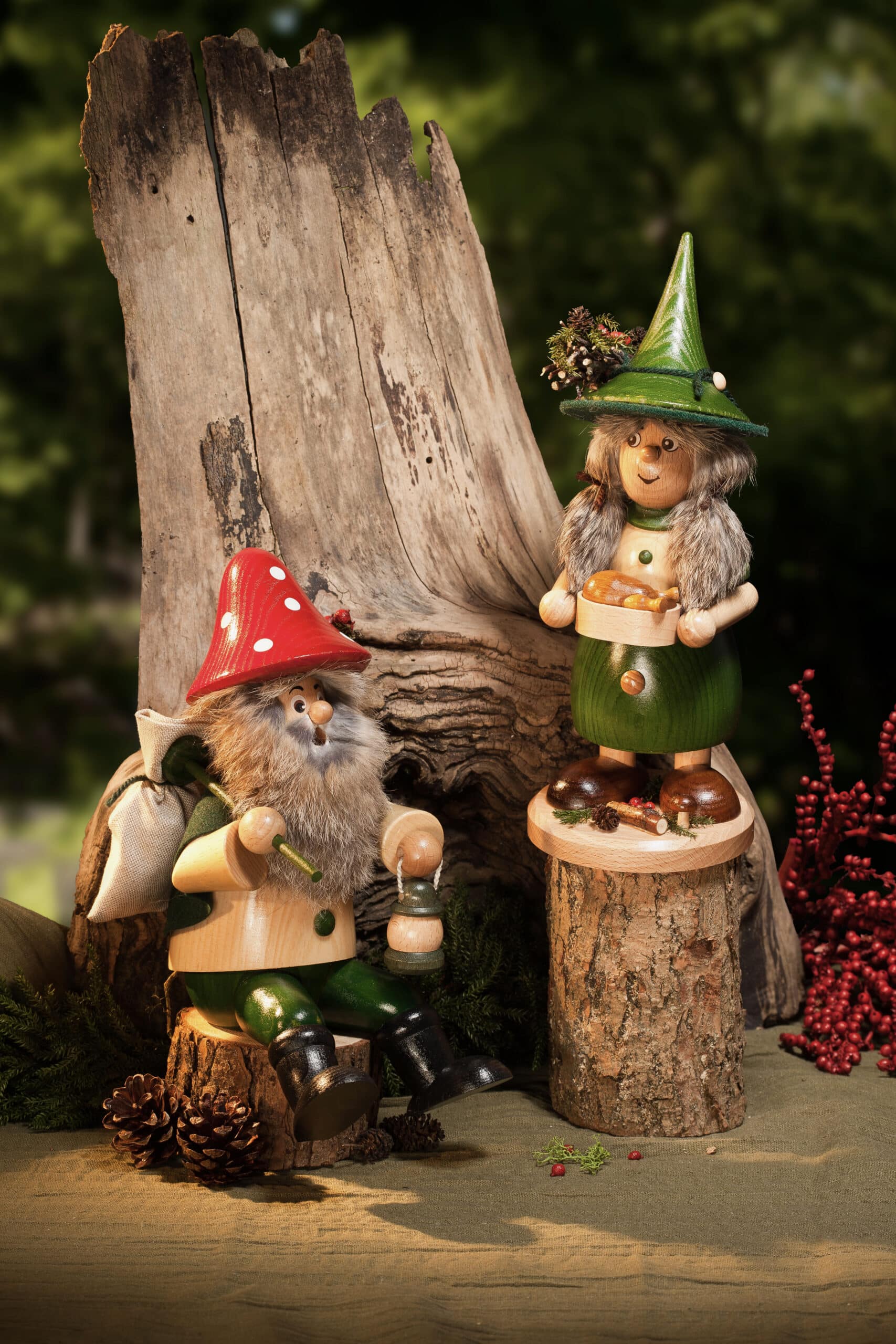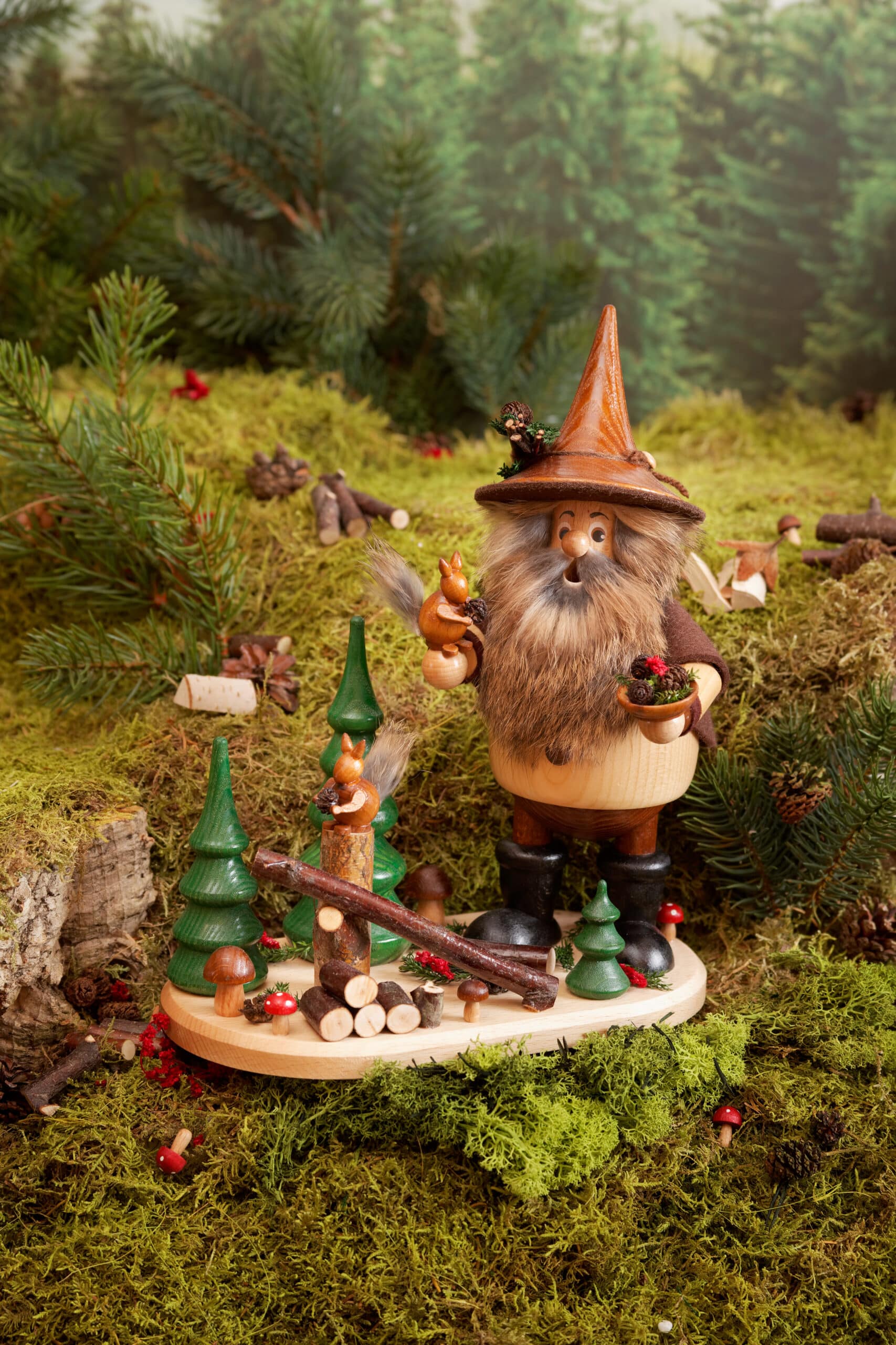 In der Produktion verwenden wir ausschließlich Hölzer aus heimischen Wäldern wie Esche, Buche und Kiefer. Durch das Einarbeiten natürlicher Materialien wie Zapfen, Äste, Moos, Beeren und Filz verleihen wir unseren Zwergen ein unverwechselbares Aussehen.Die echten Uhlig-Räucherelfen erkennt man meist an der besonderen Bartform.