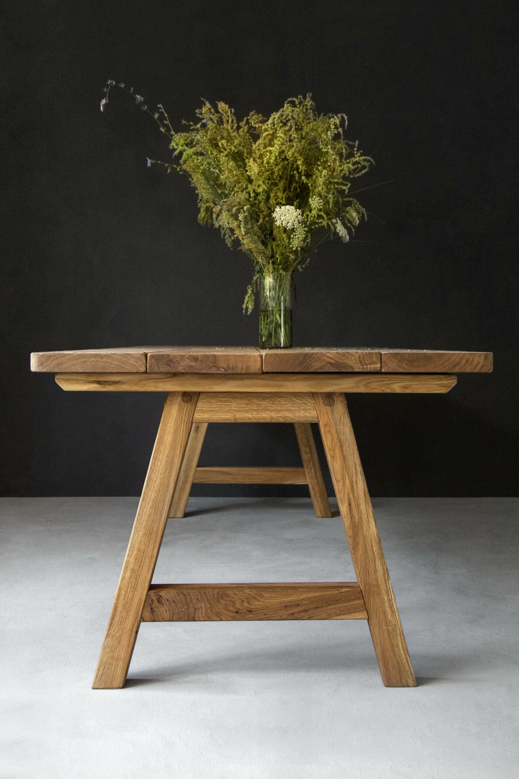 Holztisch aus Eiche mit weißen und grauen Pendelleuchten, dekoriert mit einer Vase und einem Tuch, vor neutralem Hintergr...