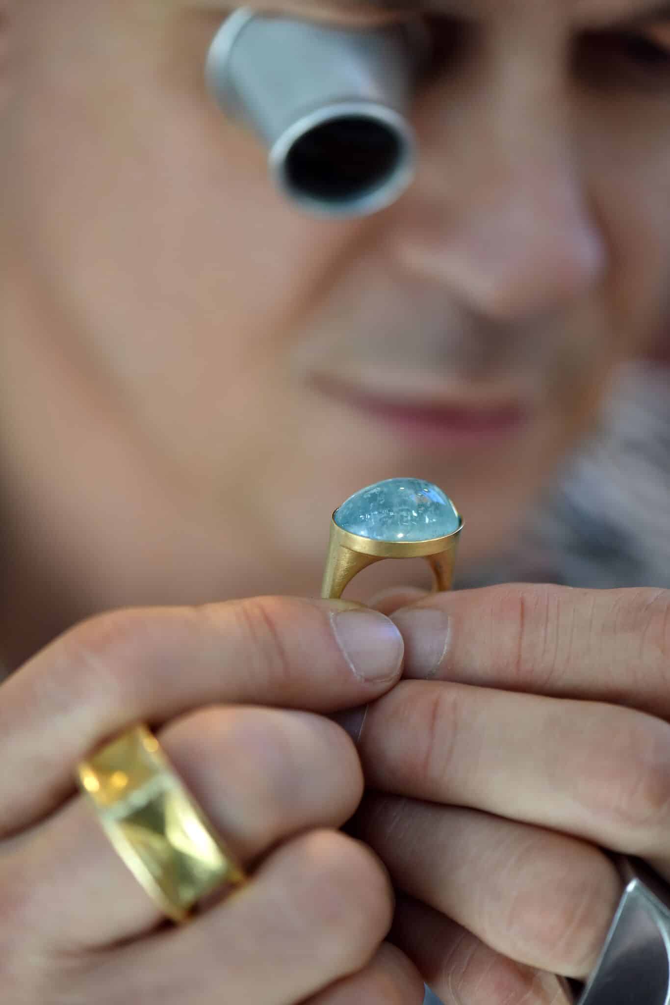 Zu seiner Arbeit sagt er: „Die Seele eines Materials offenbart seine Tiefe, wenn man damit arbeitet. Im Prozess folgt es seinen eigenen Gesetzen – zeigt sein eigenes Spiel mit Licht und Schatten. Ich folge, lenke und gestalte das Material zu Schmuck.“