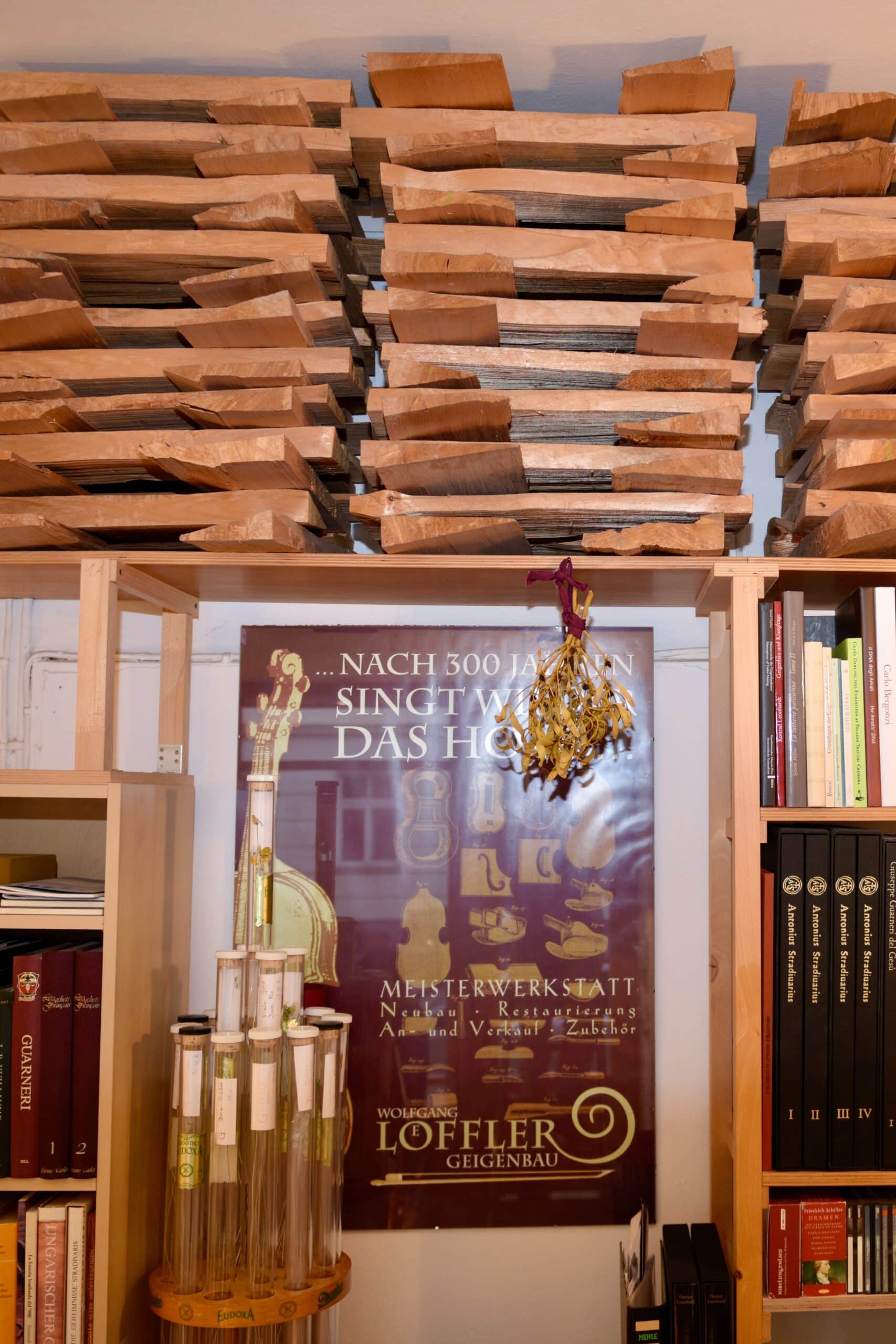 In dieser ruhigen und doch arbeitssamen Atmosphäre kann er sich ganz der Restaurierung und dem Bau seiner Instrumente widmen. Die Werkstatt bietet zudem Platz, um sämtliche Instrumente auszuprobieren. Dafür stehen verschiedene alte Meister-Instrumente zum Vergleich bereit.