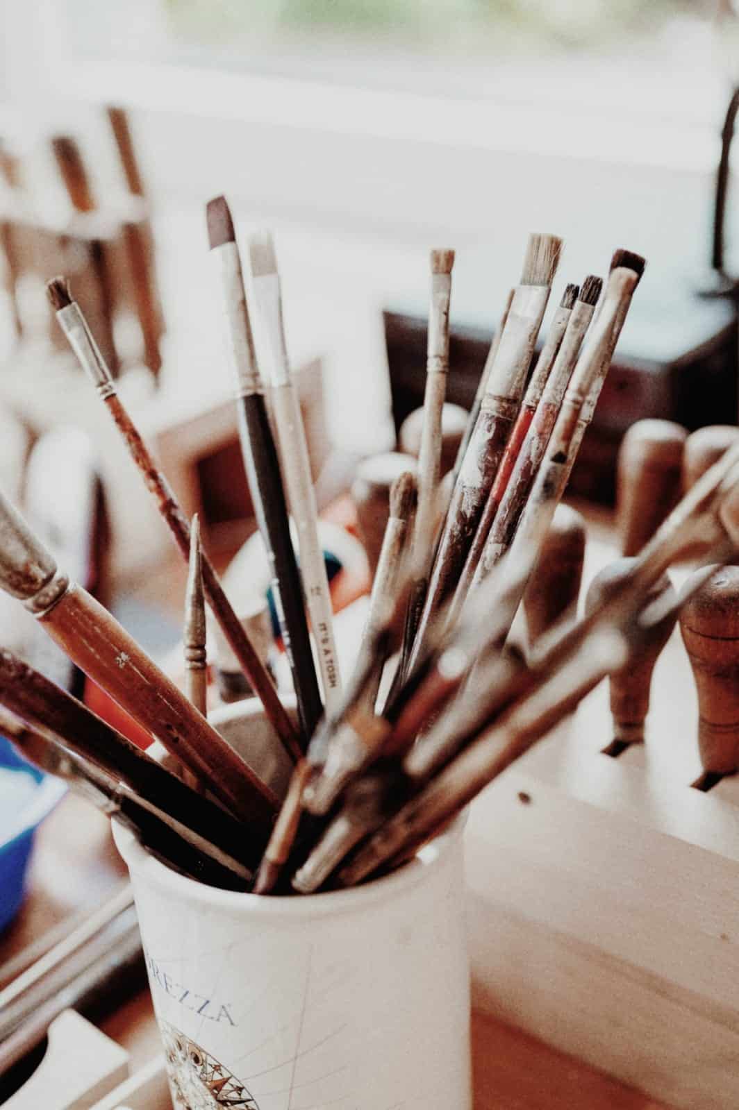 Historisches Foto von Alfred Bartsch mit einer Geige, umgeben von Geigenbau-Werkzeugen und Farbpaletten.