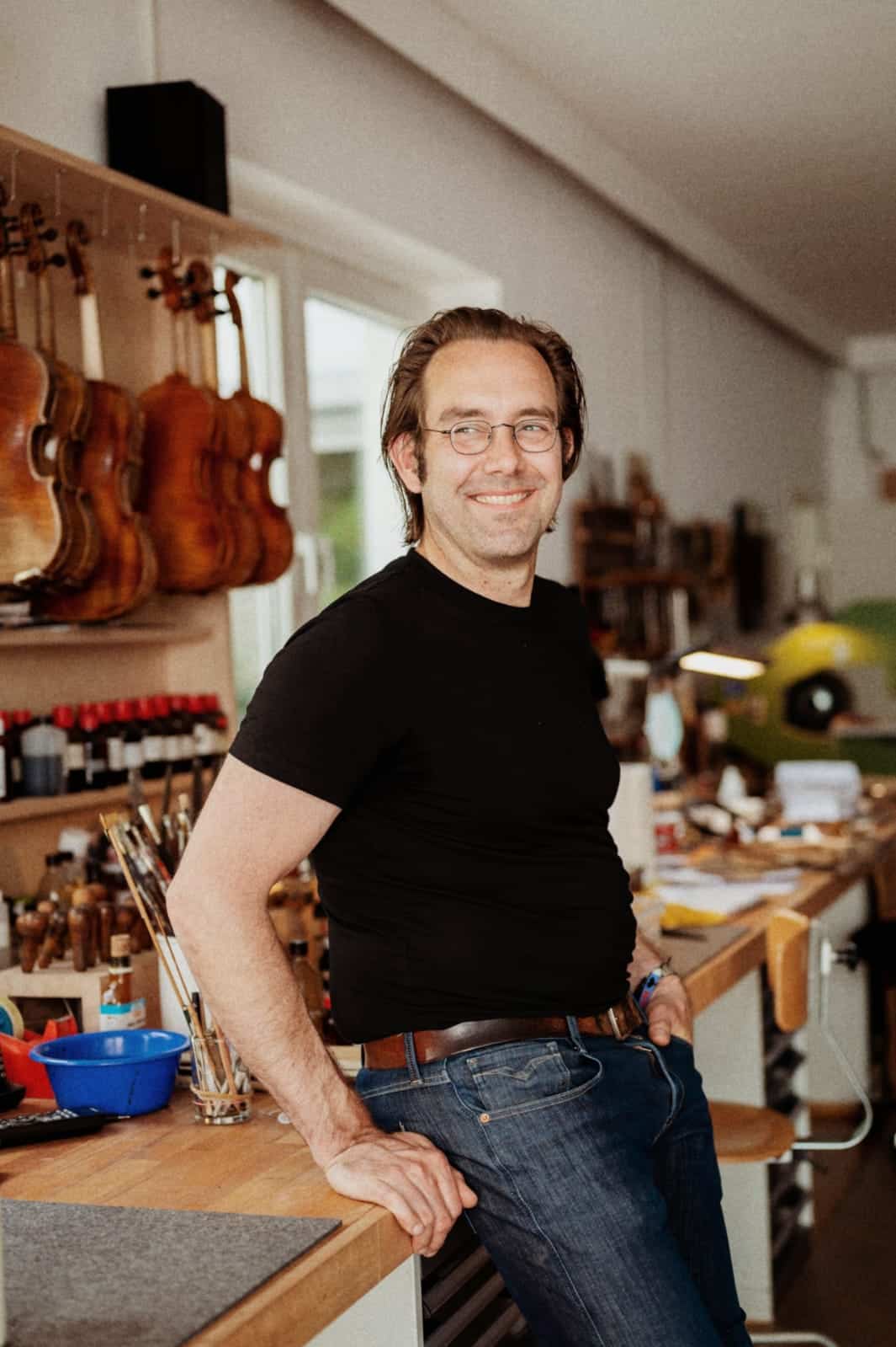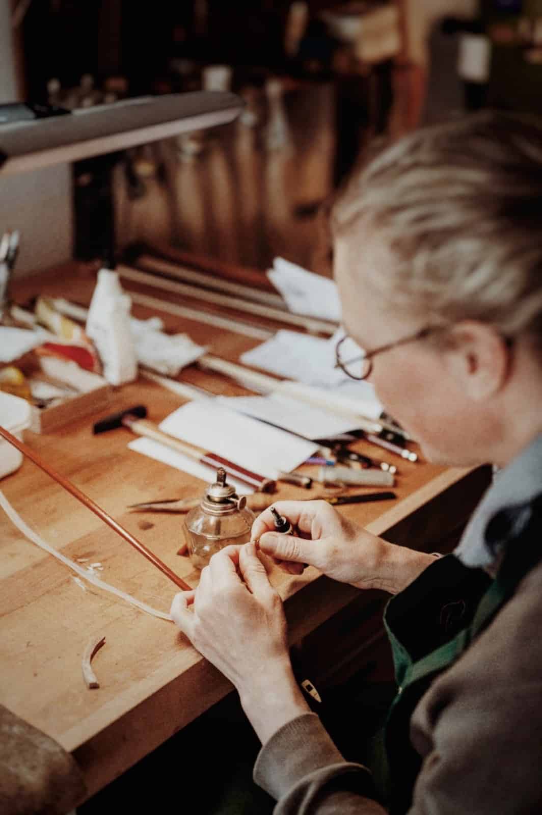 Johannes Bartsch stimmt eine Geige in seiner Werkstatt in Essen, umgeben von handwerklichen Utensilien.