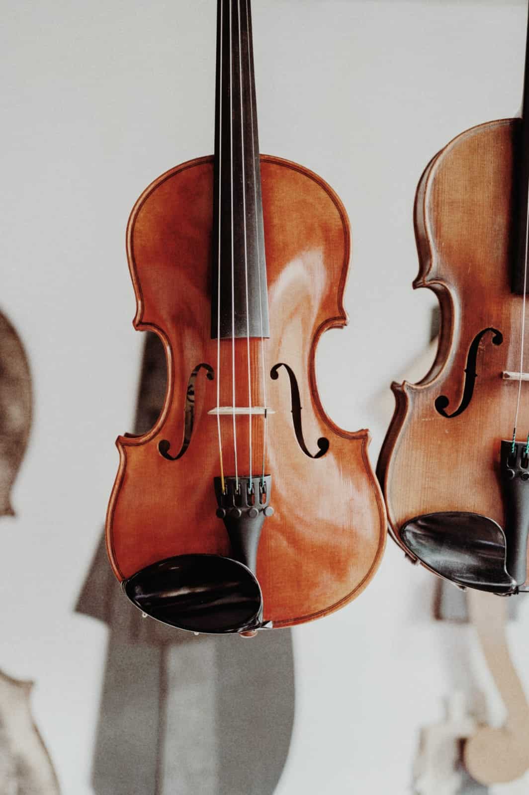 Florian Bartsch, Eva Herweg und Johannes Bartsch halten Geigen in ihrer Werkstatt in Essen, umgeben von Instrumenten.
