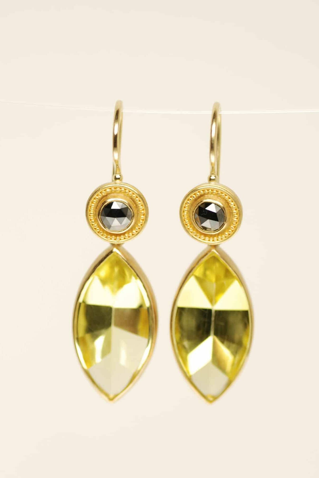 Detailaufnahme von verschiedenen Schmuckstücken, darunter goldene Ohrringe mit Edelsteinen in Blau, Rosa und Grün.