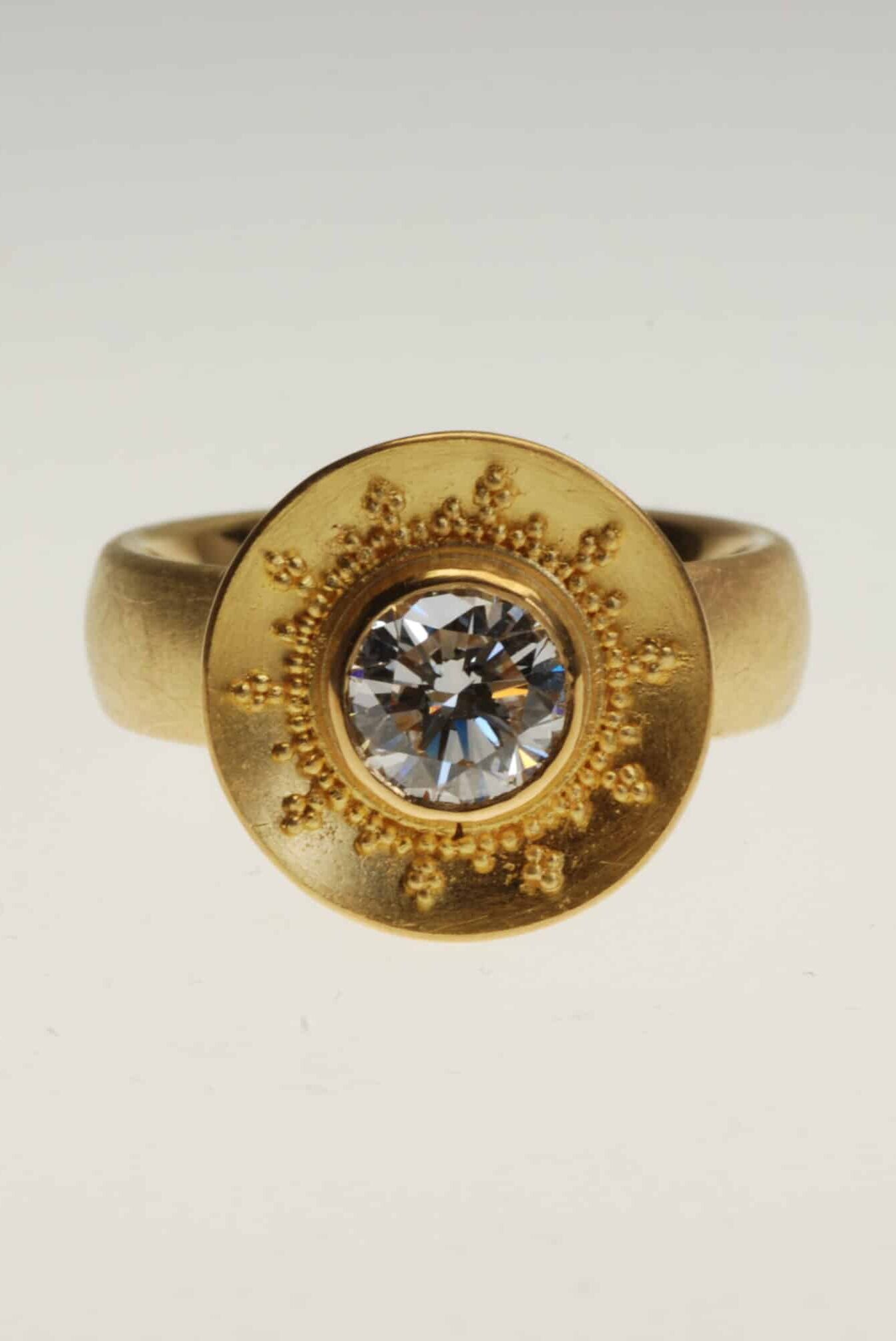 Auch beherrscht Simone Buch die Kunst der Granulation, eine seltene, alte etruskische Technik, bei der kleinste Goldkügelchen zu Mustern aufgeschweißt werden. Es ist ihr ein besonderes Anliegen, diese fast ausgestorbene Technik an ihre Auszubildenden weiterzugeben.