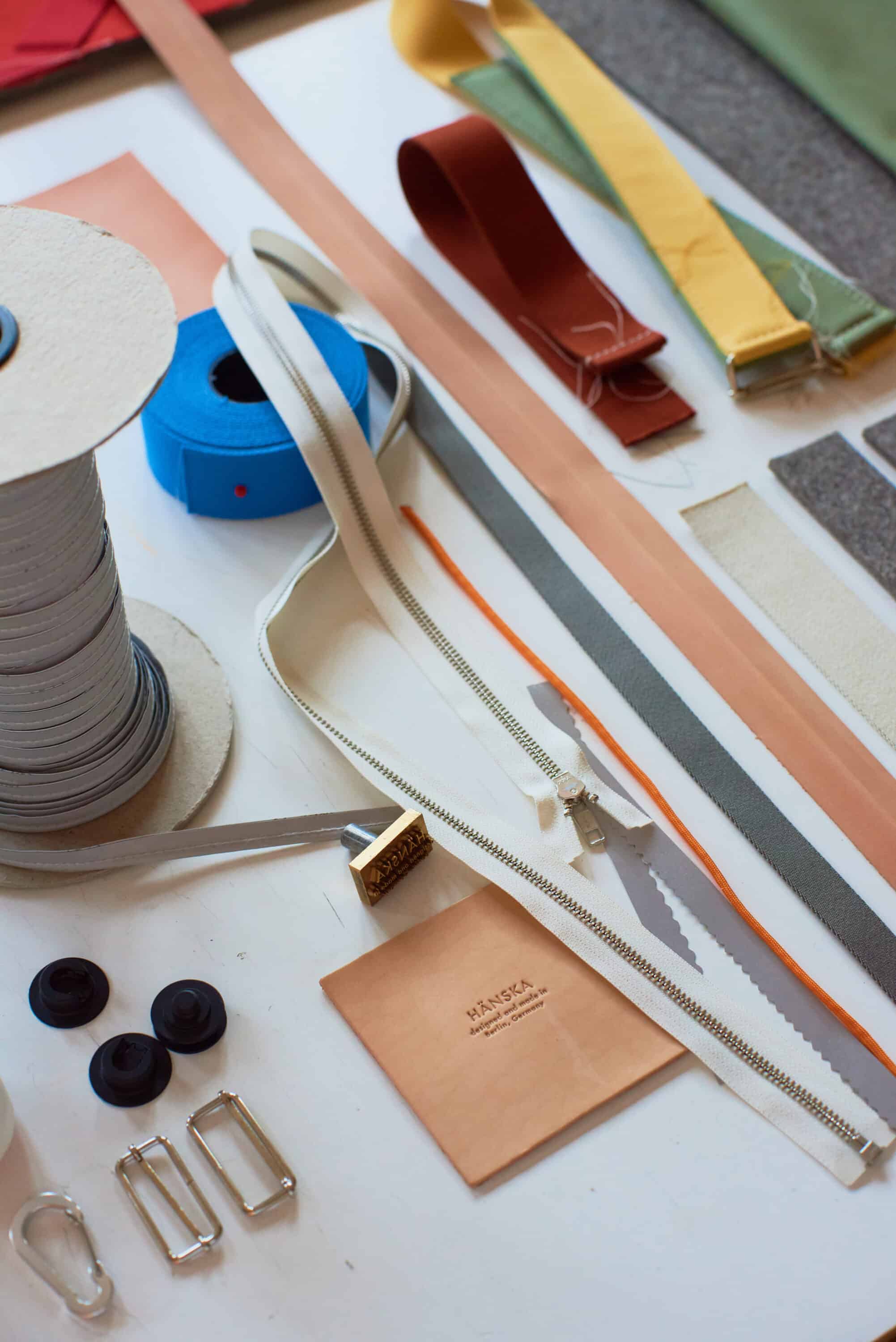 Seit 2021 werden die Schultaschen in einem Familienbetrieb in Porto, Portugal, produziert. Die restliche Kollektion und alle Sonderanfertigungen schafft ein kleines Team per Hand im Berliner Studio. Dass alle Gewerke im Haus frei kommunizieren können, ist ein wertvoller Aspekt ihres stetig wiederkehrenden Entwurfprozesses.