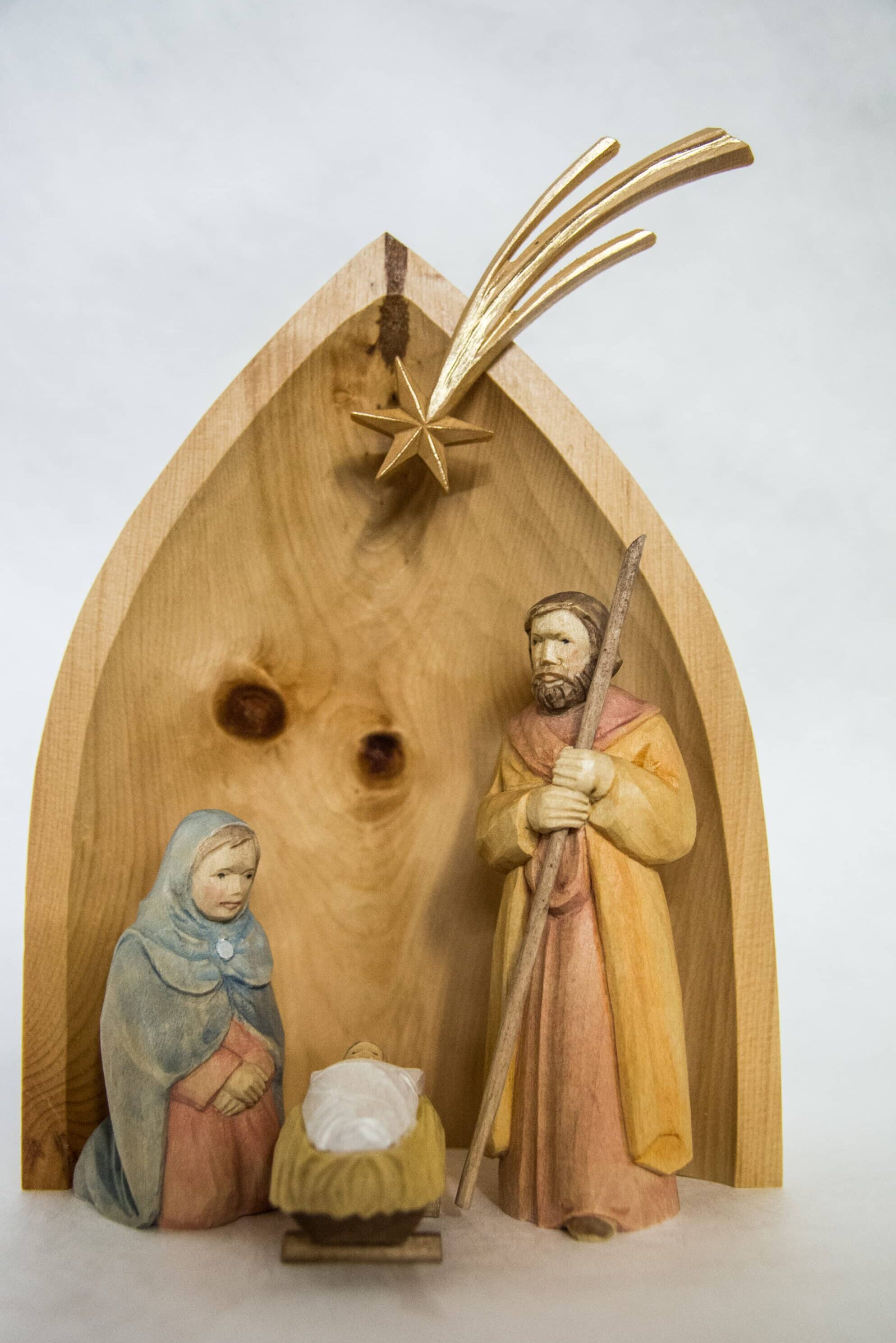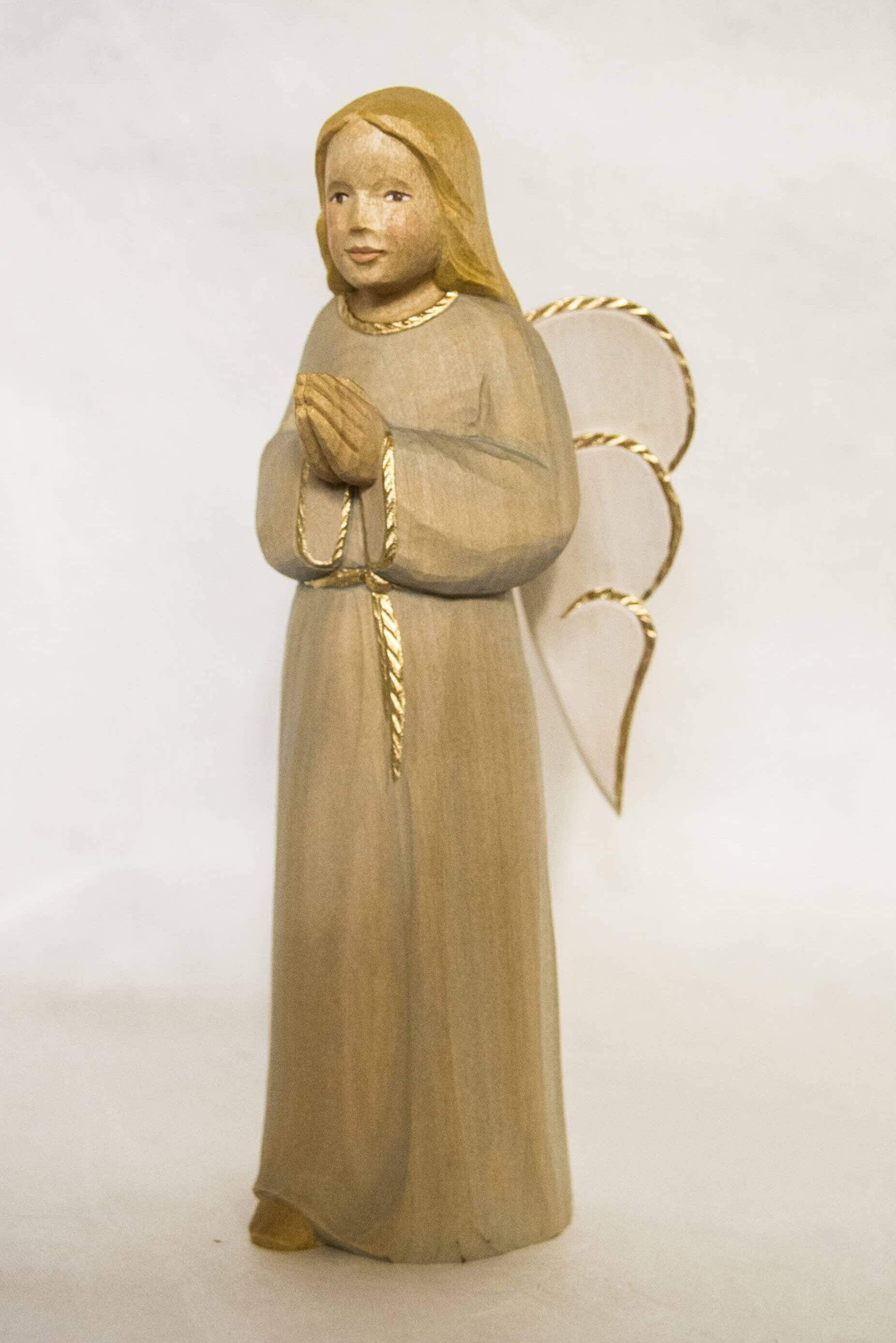 Ruhige, runde Formen und helle pastellige Farben zeichnen diese Arbeiten aus. Spezialisiert hat sich die Holzbildhauerin gewissermaßen auf Krippenfiguren und Engel, erhältlich in verschiedensten Größen von 6 bis 35 cm. Engel haben im Erzgebirge eine lange Tradition als Licht- und Schutzbringer. Sie sind erhältlich mit verschiedenen Instrumenten, mit Kerze, Buch, Stern oder als Schwebeengel zum Aufhängen.