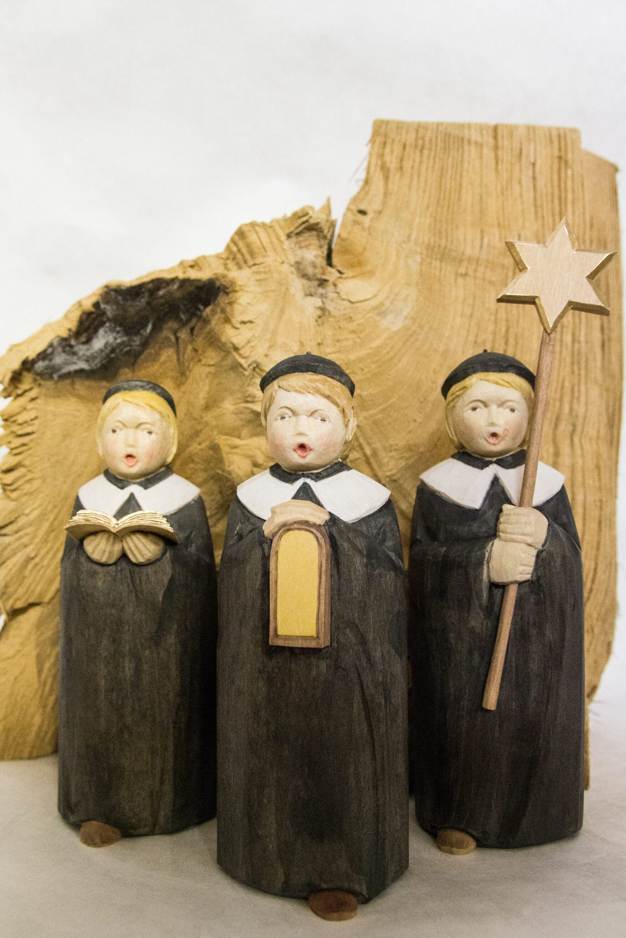 Hier entstehen traditionell erzgebirgische Schnitzereien wie Engel, Krippen, Kurrendesänger und Blumenkinder als Einzelanfertigung in Handarbeit. Solchen Figuren mit weichen Gesichtszügen kann Silvia Kalbe besonders gut Ausdruck verleihen.