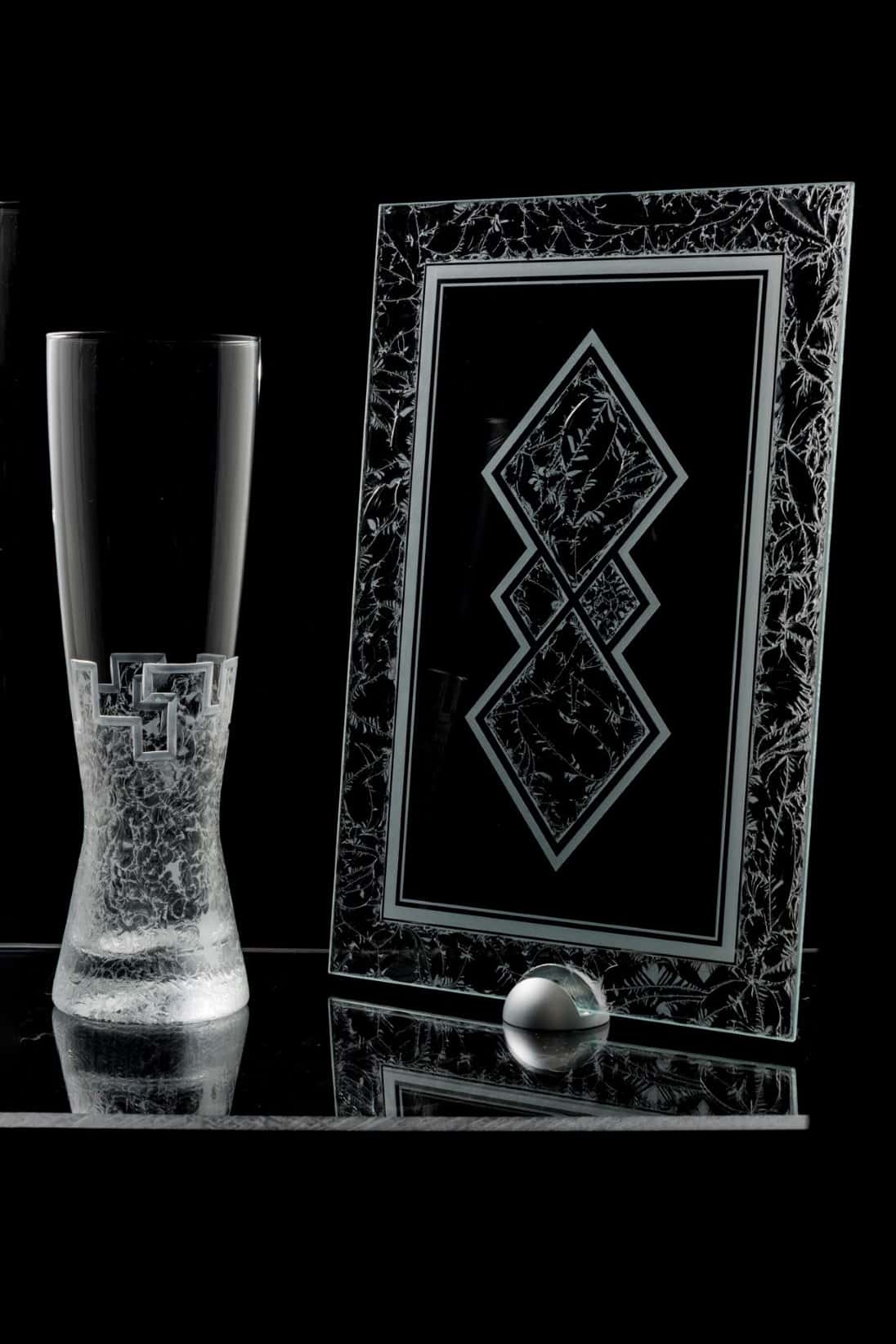 Nur das Graveurzeug kann ihr für ihre Ideen natürlich nicht genügen. Immer wieder greift sie mit „schwerem Gerät“ durch und schafft neue Objekte. Die Glassäge, die Glasbohrmaschine, die Flächenschleifscheibe und die Poliermaschine haben dann ihren Einsatz. Auch ihr Repertoire an Gravurtechniken hat sie stetig ihren Anforderungen angepasst. Die Sandstrahltechnik zum Beispiel, bei der mit präzise erstellten Schablonen gearbeitet wird. Und jetzt auch, endlich aus den Kinderschuhen herausgewachsen, die Lasergravur in einer Technologie der neusten Generation.