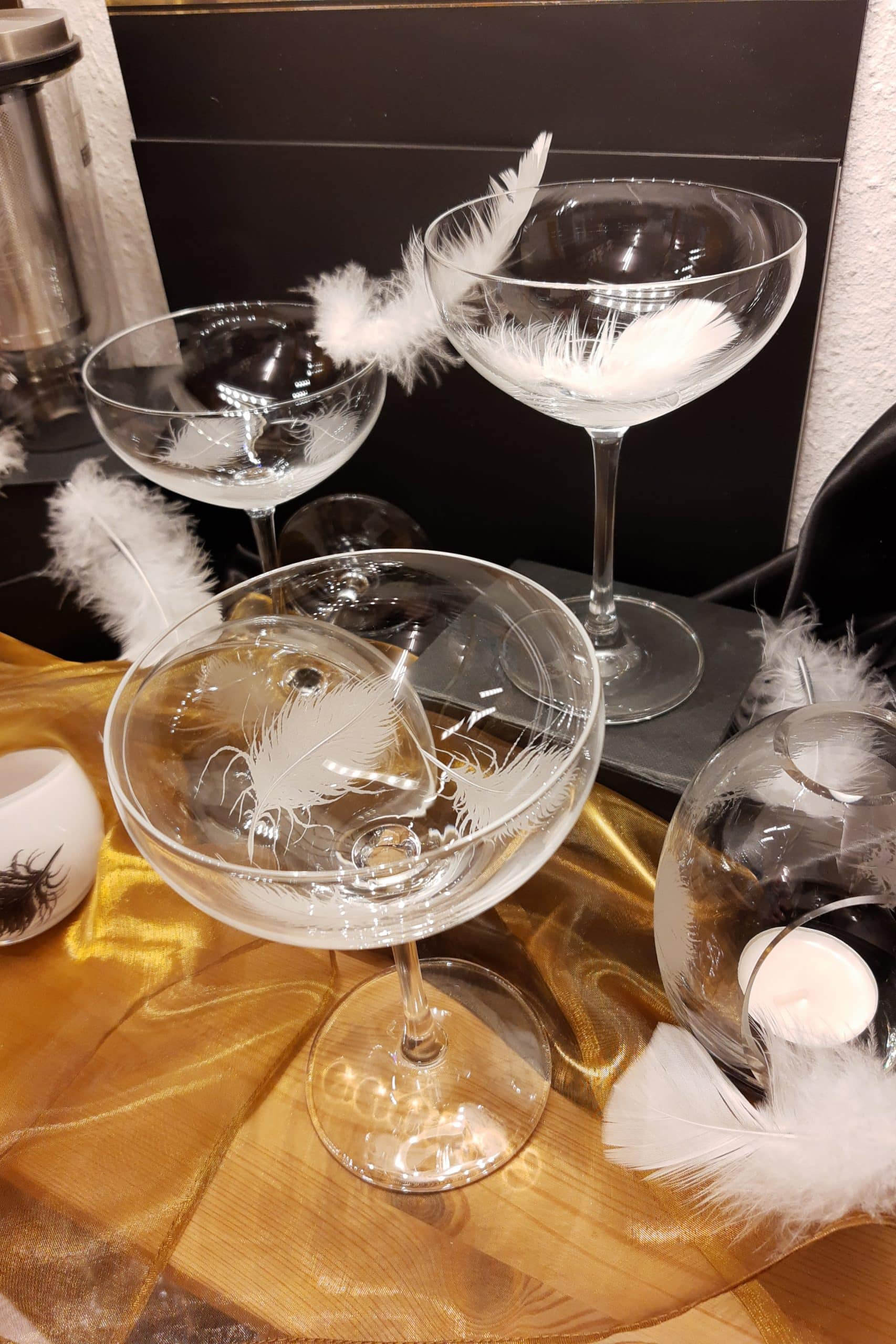 Da sind feine Kelchgläser mit zarter Federgravur – täuschend echt; wuchtige Sektkelche mit heftig tief gesetzten Schnitten – prickelnd schon beim Berühren; Longdrinkbecher mit schillerndem, geschwungenem Band – in Eisblumentechnik mit Knochenleim erzeugt… Wie entsteht das alles?