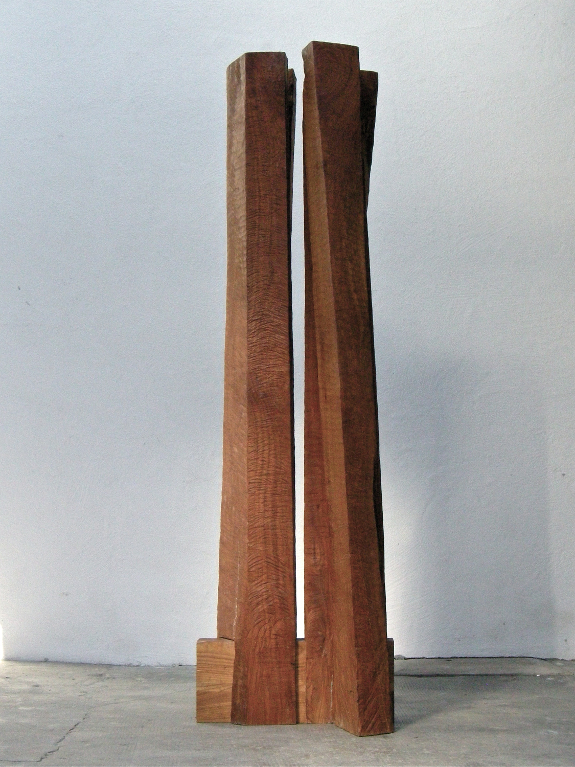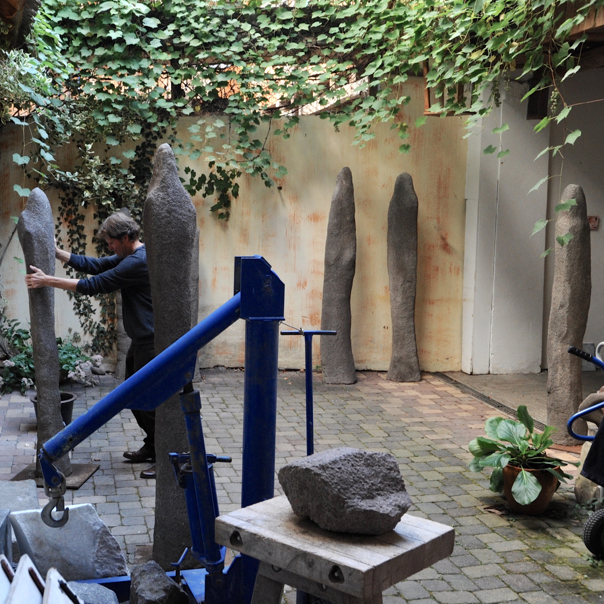 In der Bildhauerei nutzt er Materialien wie Stein, Holz, Beton und Eisen. Seine Arbeitsweise ist oft ein Prozess der Reduktion, bei dem er Formen gegeneinander abwägt und die Interaktion zwischen Silhouette, Material und Oberfläche erforscht.