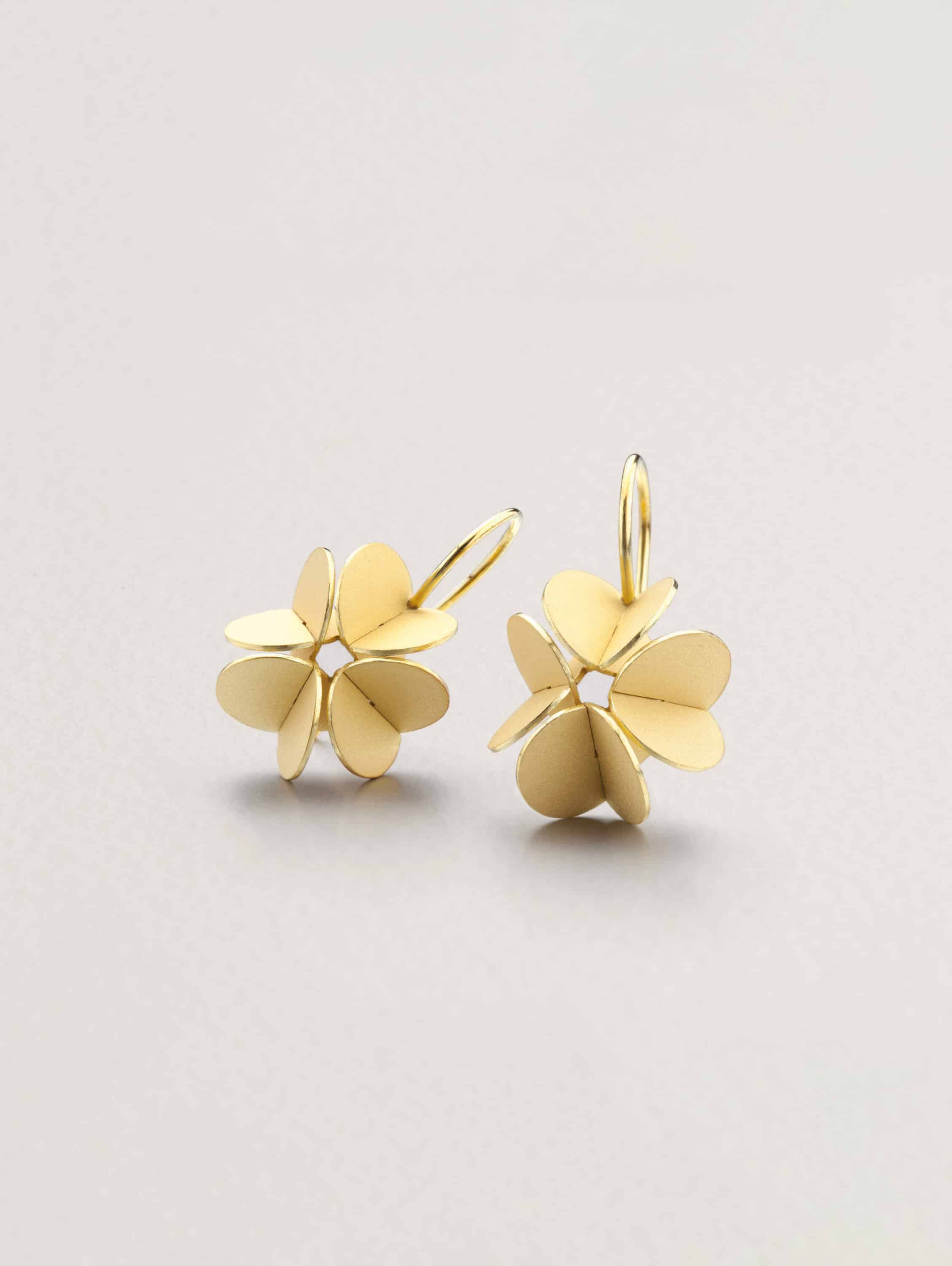 Geometrische Flächen ziehen sich wie ein roter Faden durch die verschiedenen Kollektionen, woraus durch Steck- und Falttechniken die einzelnen Schmuckstücke entstehen. Es entsteht ein faszinierendes Spiel von Licht und Schatten und eine architektonisch klare Ästhetik, die viel Leichtigkeit ausstrahlt.