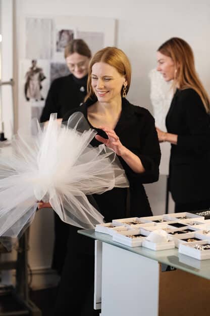 „Die Arbeit mit kostbaren Materialien macht einen automatisch achtsamer, wie zum Beispiel bei der Weiterverwendung der Schnittreste. Zero Waste und demnächst auch die Umstellung auf zertifizierte Öko-Couture-Stoffe, die momentan noch eine Rarität auf dem Markt sind, ist das Ziel der Brand.“, so die Designerinnen des Labels.