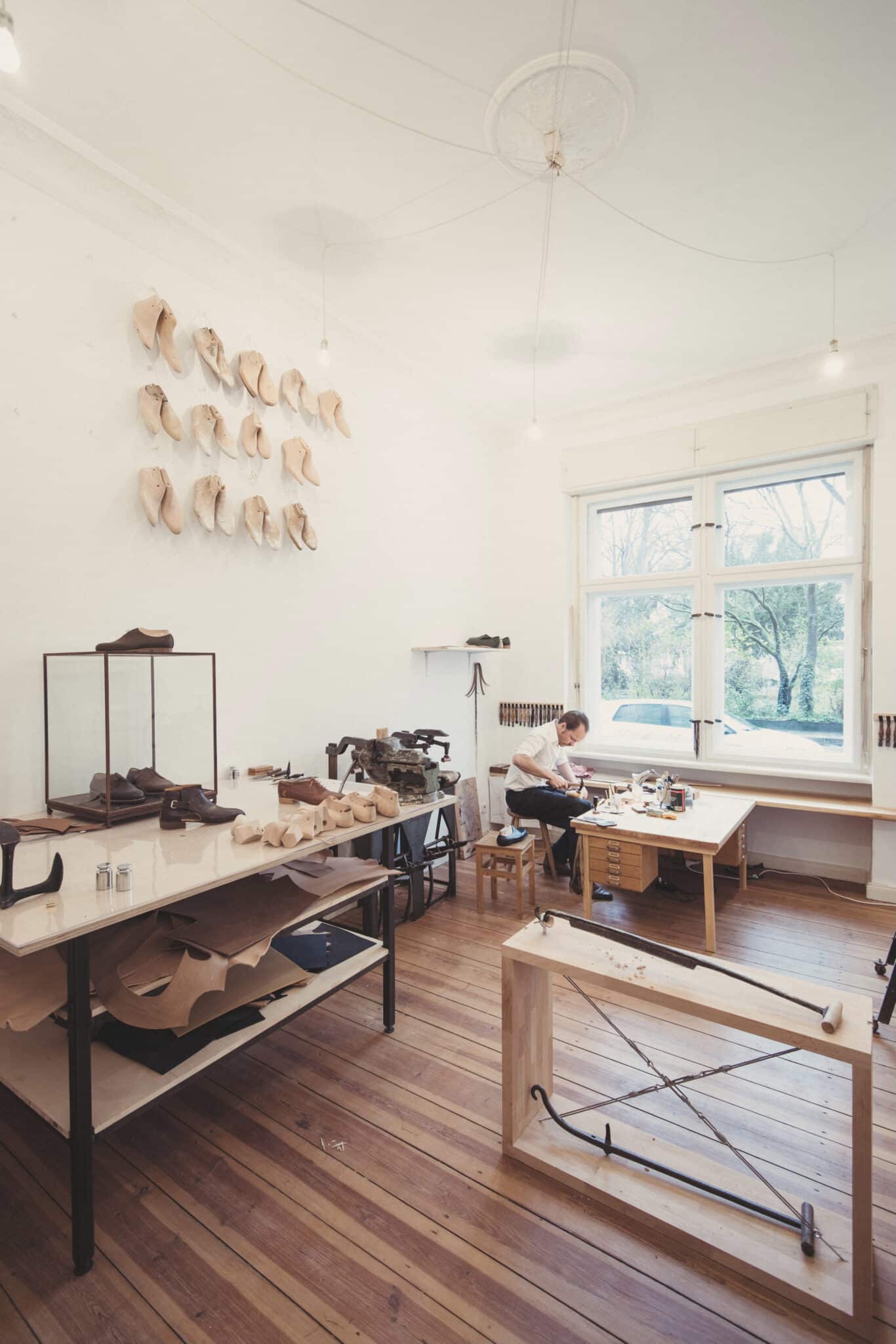 Die Werkstatt von Korbinian Ludwig Heß liegt in einem Ladenlokal eines Gründerzeitbaus. Der taghelle hohe Eingangsraum dient als Empfangs- und Anproberaum, der Nebenraum als Werkstatt. Hier werden Schuhe vom mittlerweile vierköpfigen Team in kompromissloser Handarbeit nach traditionellen Techniken gebaut. Benötigte Maschinen wie Nähmaschinen, eine Lederwalze oder die Sohlenpresse laufen mechanisch, ohne Strom. Verarbeitet werden ausschließlich Leder aus zertifizierten Gerbereien, wie Cordovan, Kalbs- und Ziegenleder.