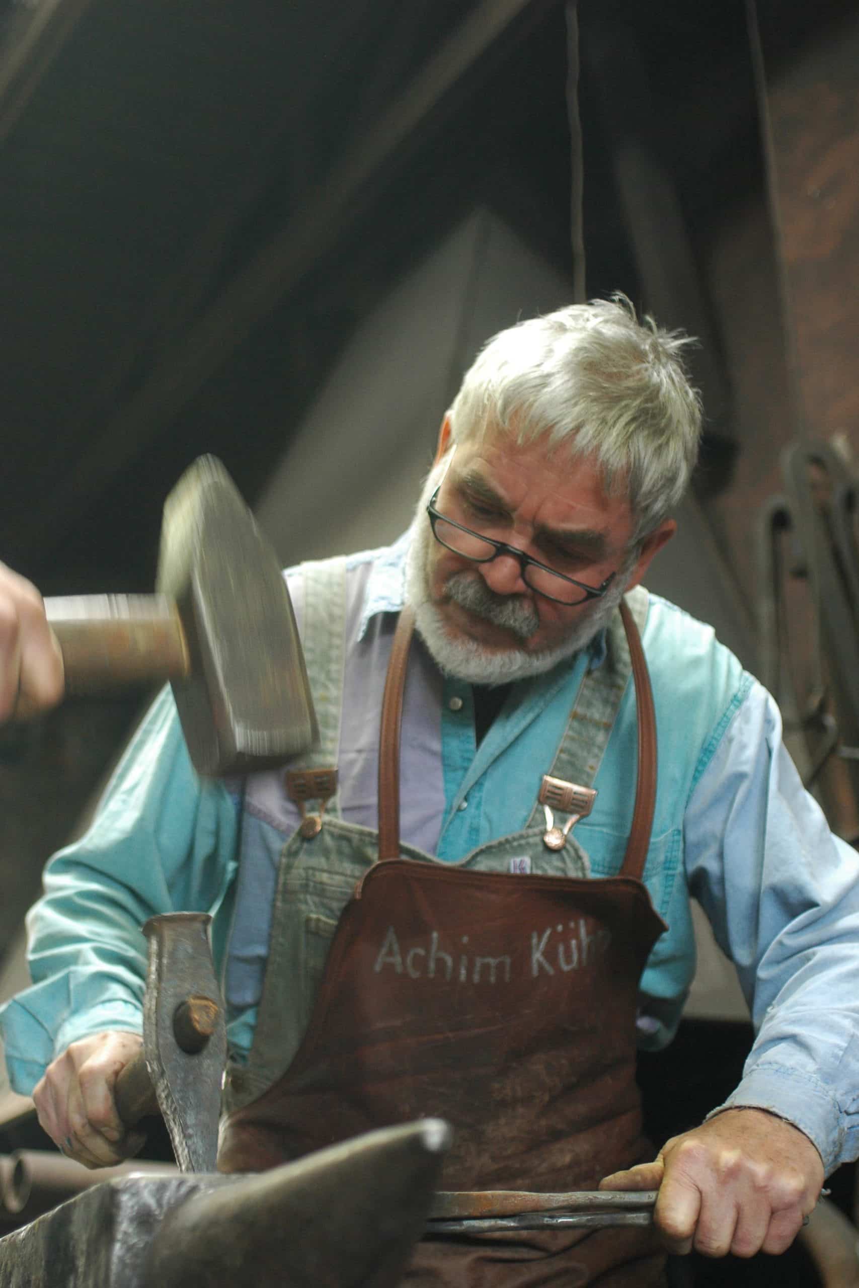 Der Berliner Achim Kühn erlernte das Schmiedehandwerk in der väterlichen Werkstatt Prof. Fritz Kühn und legte 1963 die Meisterprüfung ab. Darauffolgend studierte er Architektur an der Bauhaus Universität Weimar und arbeitet seit 1967 selbständig als Metallbildhauer, Kunstschmied, Fotograf, als Autor und Restaurator. Über einen Zeitraum von 50 Jahren bildete er Lehrlinge aus. Meisterschüler aus aller Welt trainierten unter seiner Leitung die Technik des Schmiedens.