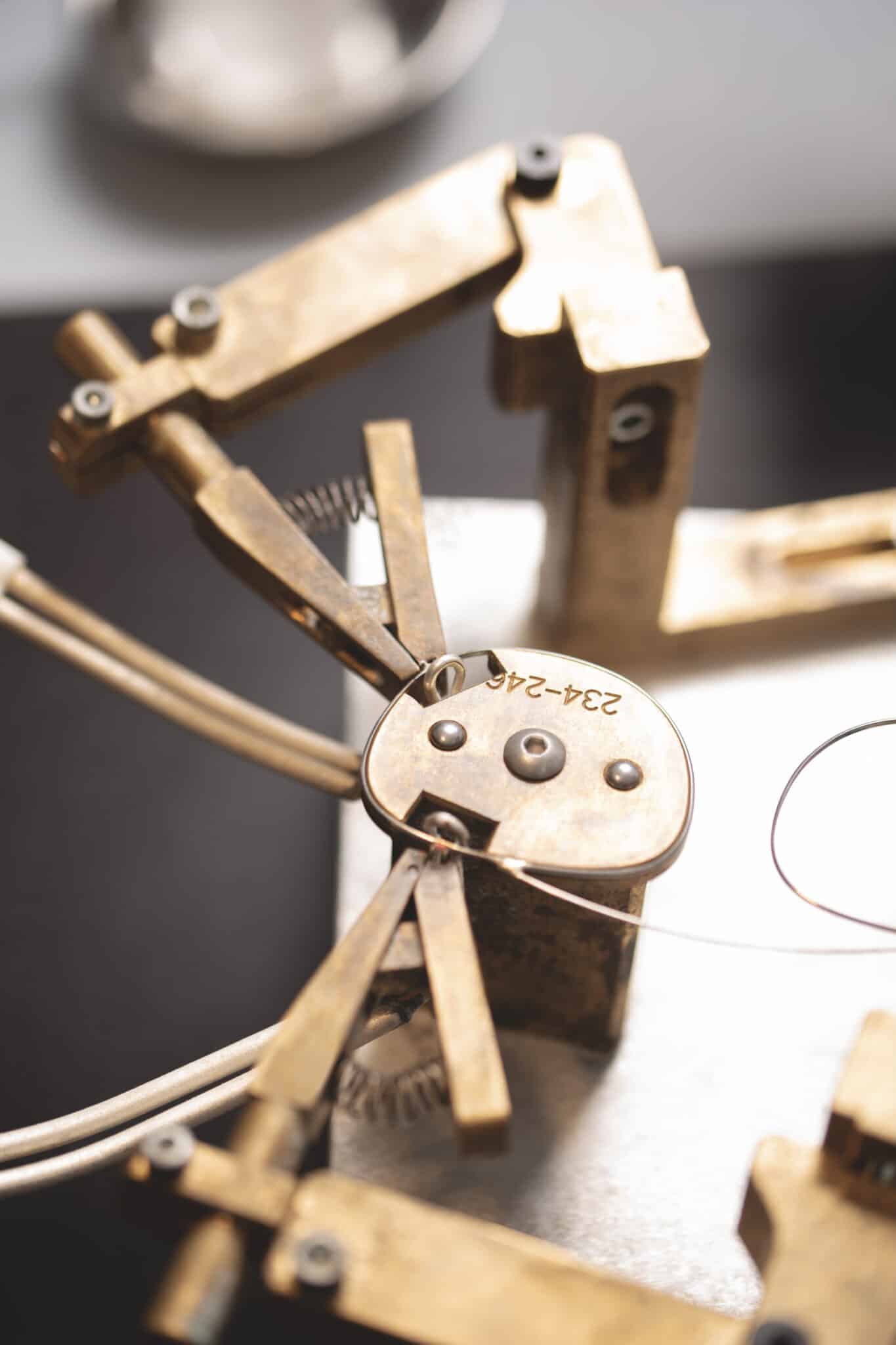 Hände löten präzise an einem Steg, umgeben von Werkzeugen und einer NIKON D750 Kamera.