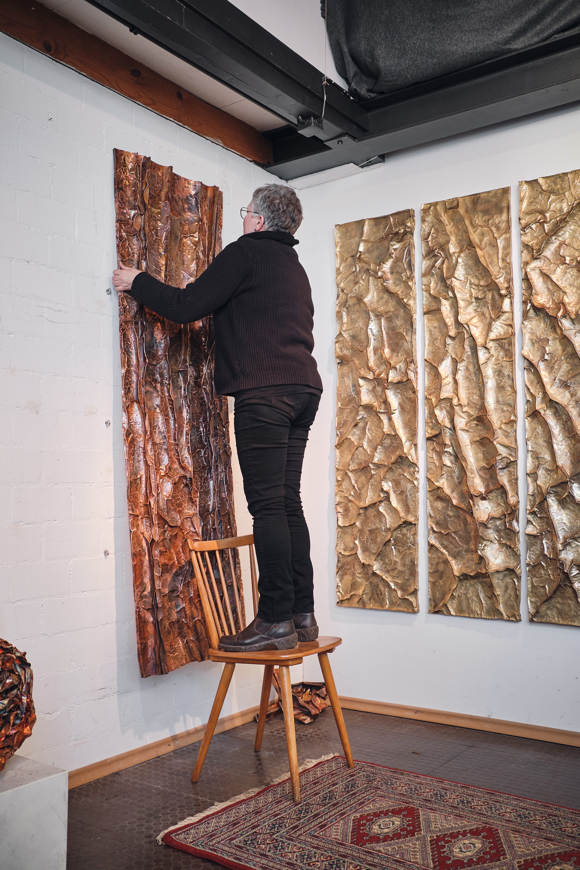 Metall gestalten macht Manuela Geugelin aus Leidenschaft. Unterschiedliche Metalle wie Kupfer, Messing, Aluminium oder Neusilber verwandeln sich zu lebendigen Landschaften. Das Spiel von Licht und Schatten, Farbe und Struktur im Zusammenspiel von Wand, Boden oder Decke verändert Räume und schafft eine neue Atmosphäre.
