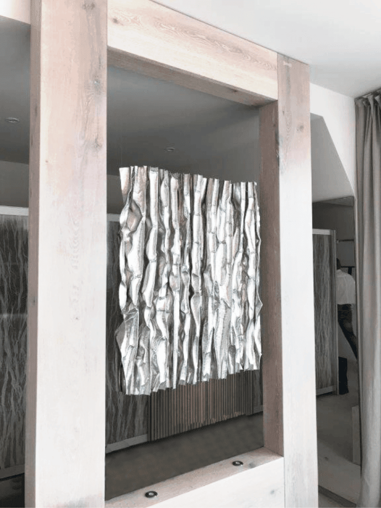 Aus dem handgeschmiedeten Metallblech können einzelne Elemente nahtlos aneinandergereiht, mit einer Schattenfuge versehen oder als Solitärwerke verwendet werden. Eigene, für die Raumgestaltung entwickelte Techniken, eröffnen flexible Möglichkeiten für die Architektur im Innen- und Außenbereich.