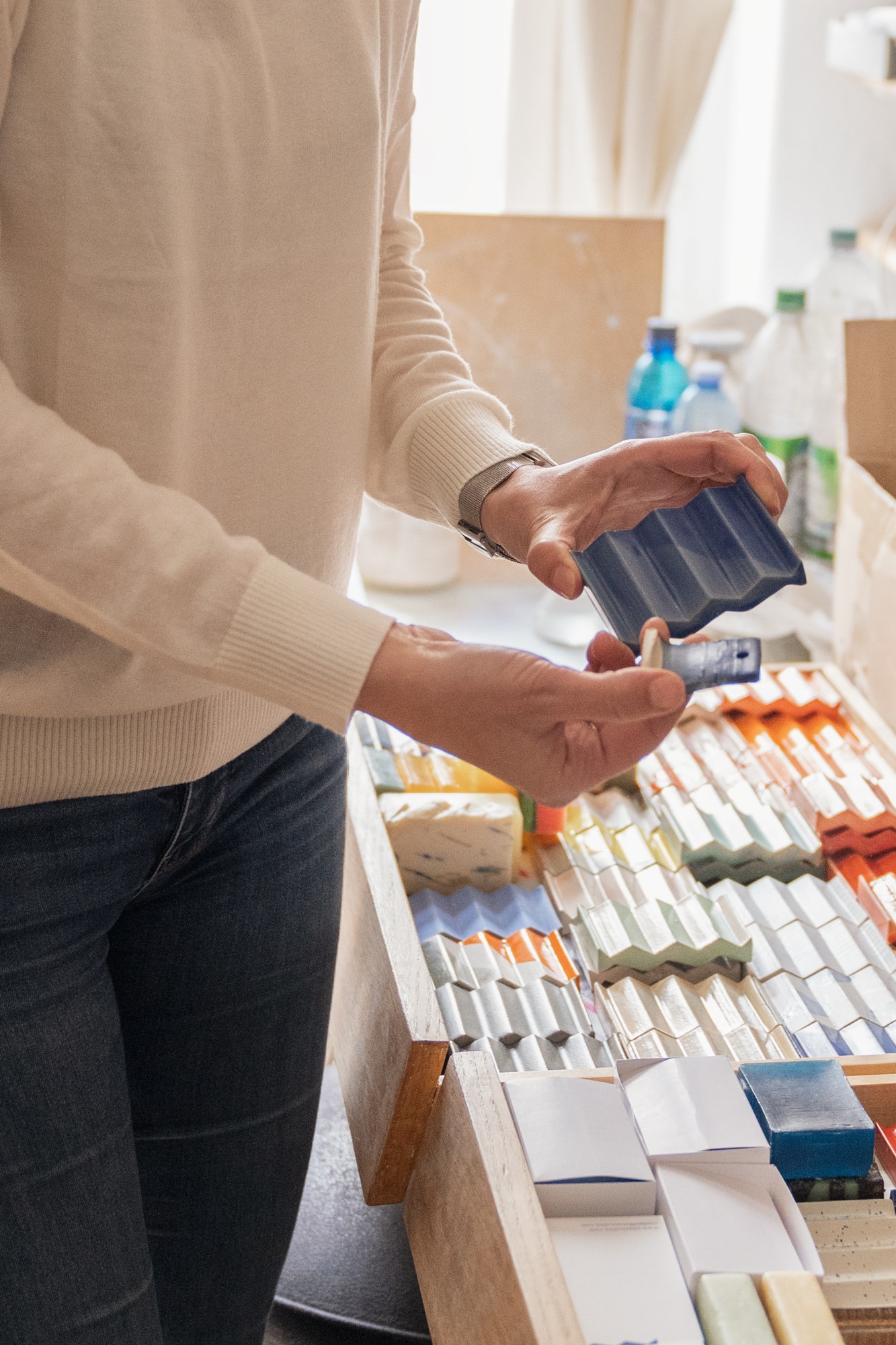 Das Ergebnis: Rocky m., eine Seifenschale mit asymetrisch-zackiger Form, die stolz den Namen der berühmten Bergkette in Nordamerika trägt. Da das Seifenstück nur auf minimalen Punkten aufliegt, kann es bestmöglich trocknen. Ein Nebeneffekt: die Haltbarkeit der Seife wird deutlich verlängert. Die Funktion ist bei einem Alltagsobjekt zentral, für Ostermeier und Jenner, die beide aus dem Kunstbereich kommen, spielt die Ästhetik eine ebenso große Rolle. Schließlich sollten auch die kleinen Dinge, die einen alltäglich begegnen, Freude machen. Die Seifenschale Rocky m. ist aus Keramik, genau genommen aus hoch gebranntem Steinzeug. Sie wird in den Christophorus-Werkstätten in Fürstenwalde handgefertigt, jedes Exemplar ist ein Unikat mit individuellem Charakter. Die Christophorus-Werkstätten sind eine anerkannte Werkstatt für behinderte Menschen. Die über 420 Beschäftigten können wegen Art und Schwere ihrer Behinderung nicht oder noch nicht auf dem allgemeinen Arbeitsmarkt tätig sein.