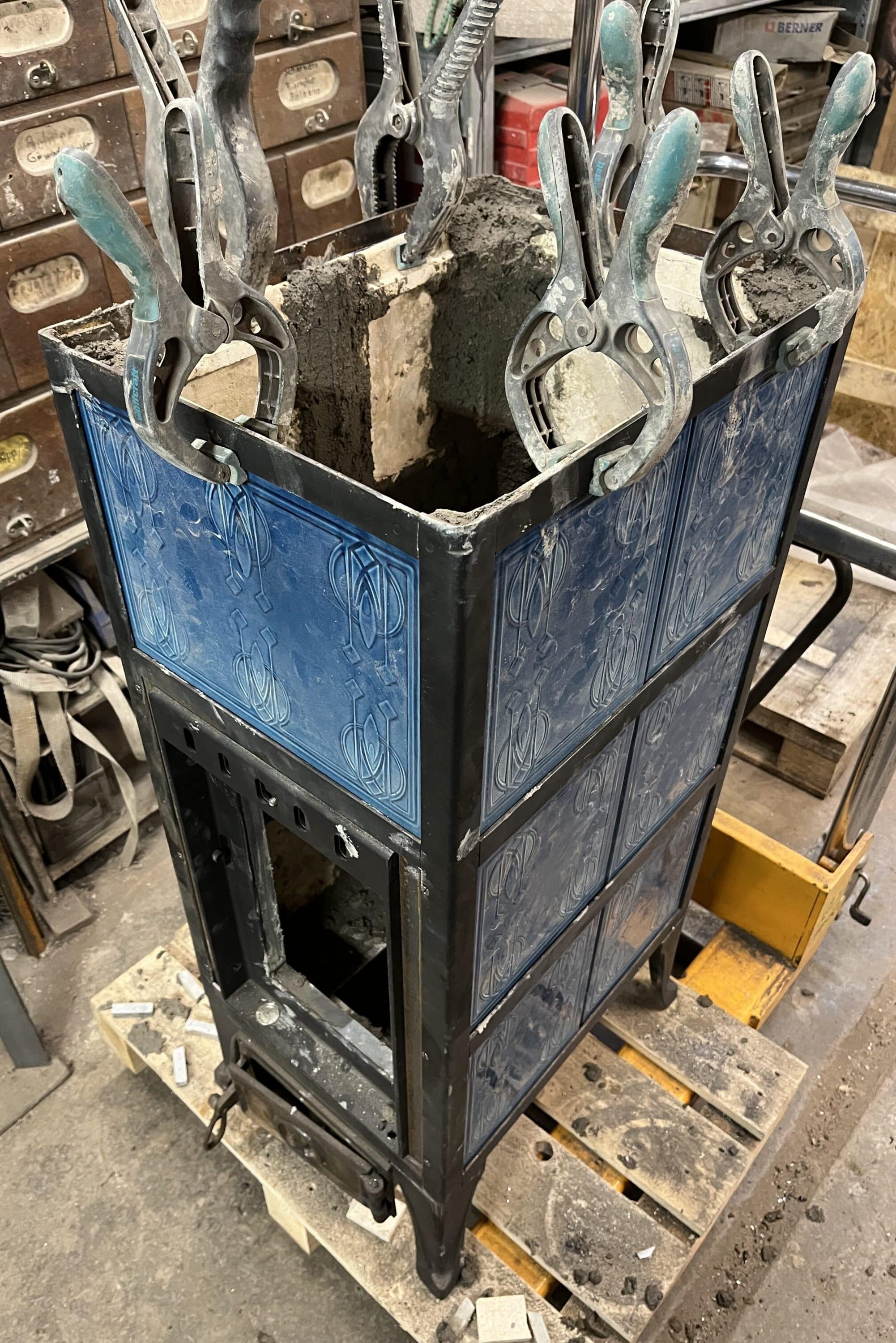 Jedes der Einzelstücke wird zum Neuaufbau vollständig in seine Einzelteile zerlegt. Die gusseisernen Teile und Kacheln werden bestmöglich aufgearbeitet und der gesamte Ofen wieder neu errichtet. Die Außenhülle des Kachelofens wird weitgehend erhalten und stabilisiert, sodass altersgemäße Gebrauchsspuren durchaus sichtbar bleiben dürfen, die volle Funktion aber gewährleistet ist. Keramik-Kacheln werden repariert und retuschiert, nicht aber aufwändig erneuert. Sollte einmal ein gusseisernes Teil irreparabel kaputt sein, so findet sich oft ein passendes Teil im Ersatzteillager, welches nach über 40 Jahren des Sammelns und Aufbewahrens gut gefüllt ist.