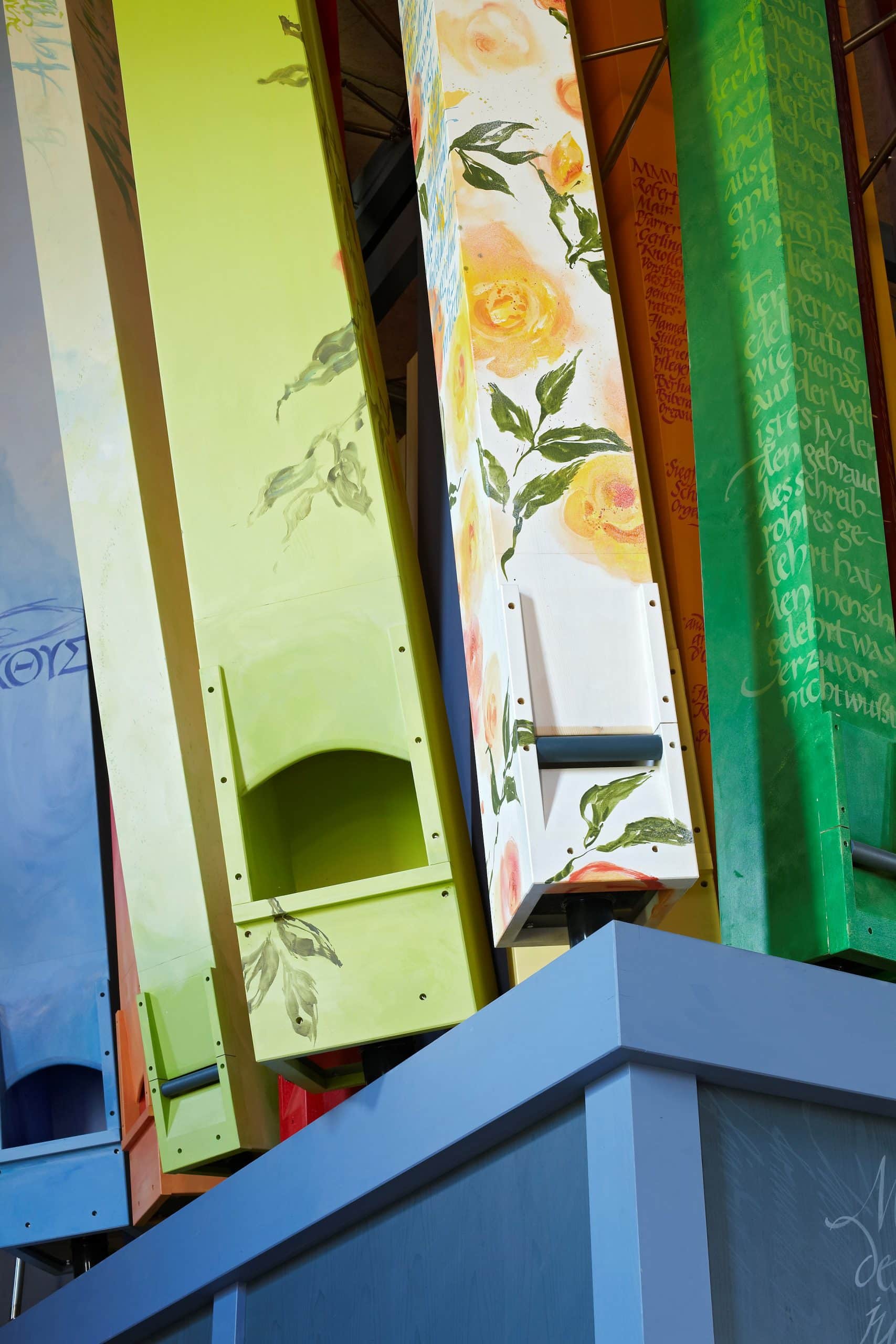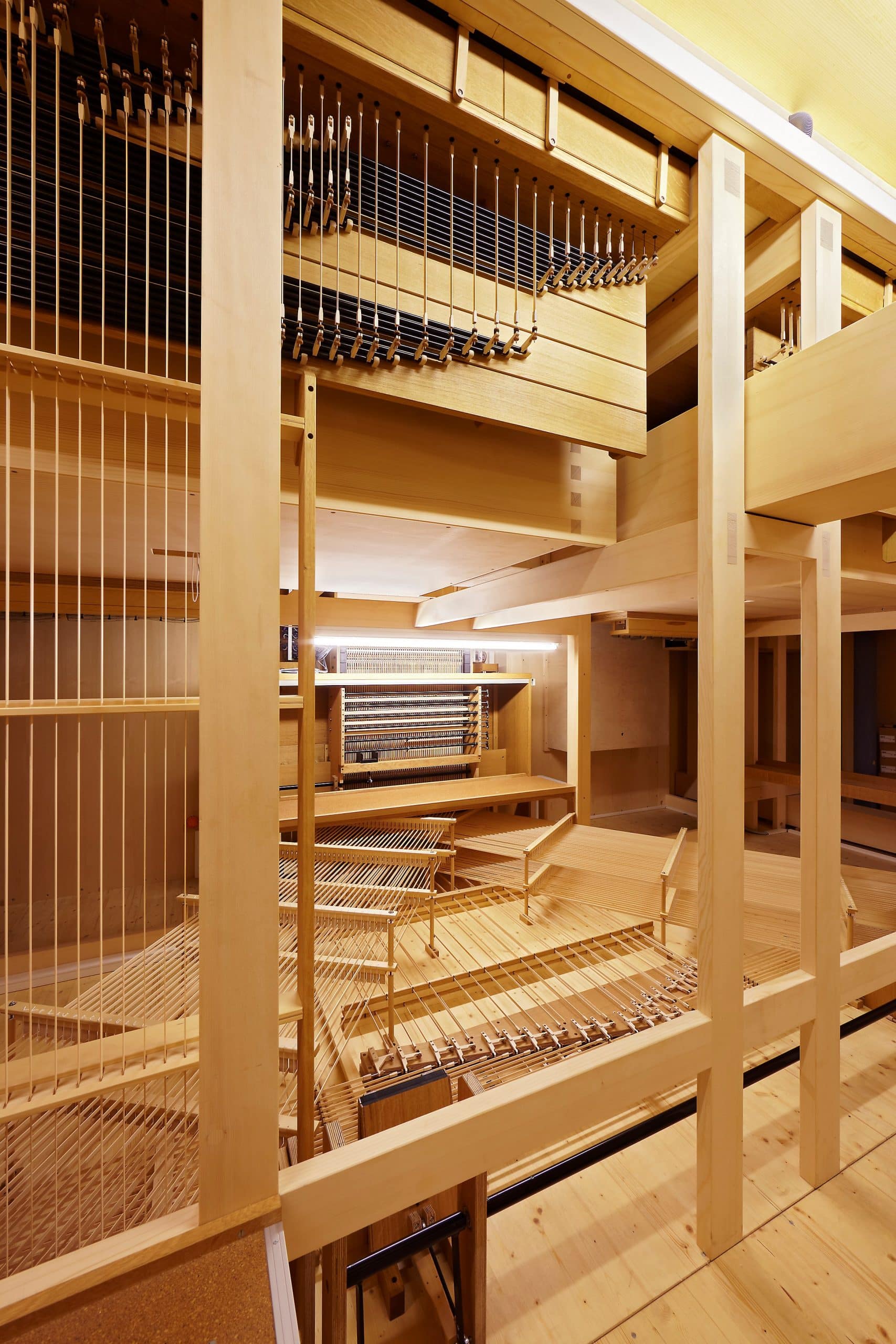 Innenansicht einer Orgelbauwerkstätte mit Holzregalen und Lichtquelle, die das handwerkliche Design betont.
