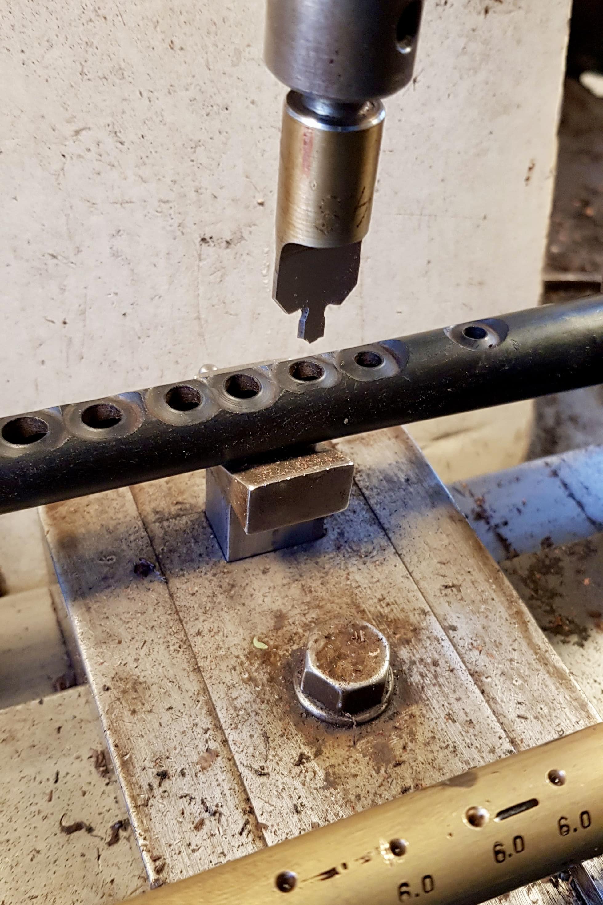 Detailaufnahme einer Person, die mit einem Messschieber eine Flöte in der Meisterwerkstatt Hammig überprüft.