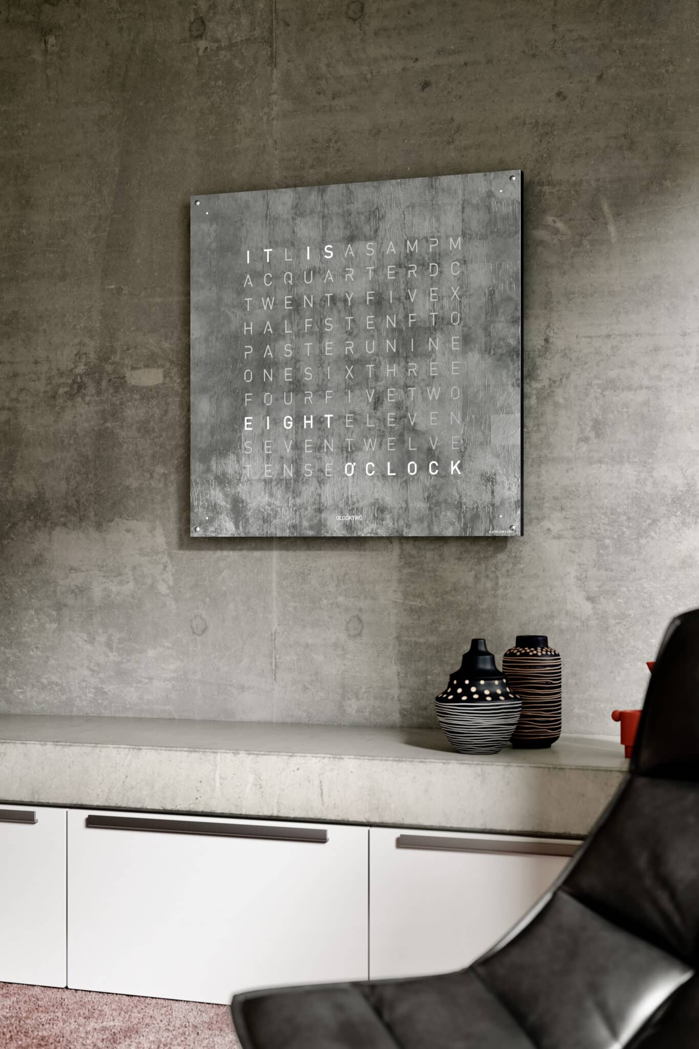Von der Erde über Millionen von Jahren hervorgebrachte Materialien, wie Schiefer, Gold oder Kupfer, dienen als Grundlage für die Fronten. Sie werden mit Feuer bearbeitet, von Hand gerostet oder durch Prozesse der Oxidation veredelt. Eine Qlocktwo zieht ihre Betrachter unmittelbar in ihren Bann und ist bis heute die weltweit persönlichste Form der Zeitanzeige.