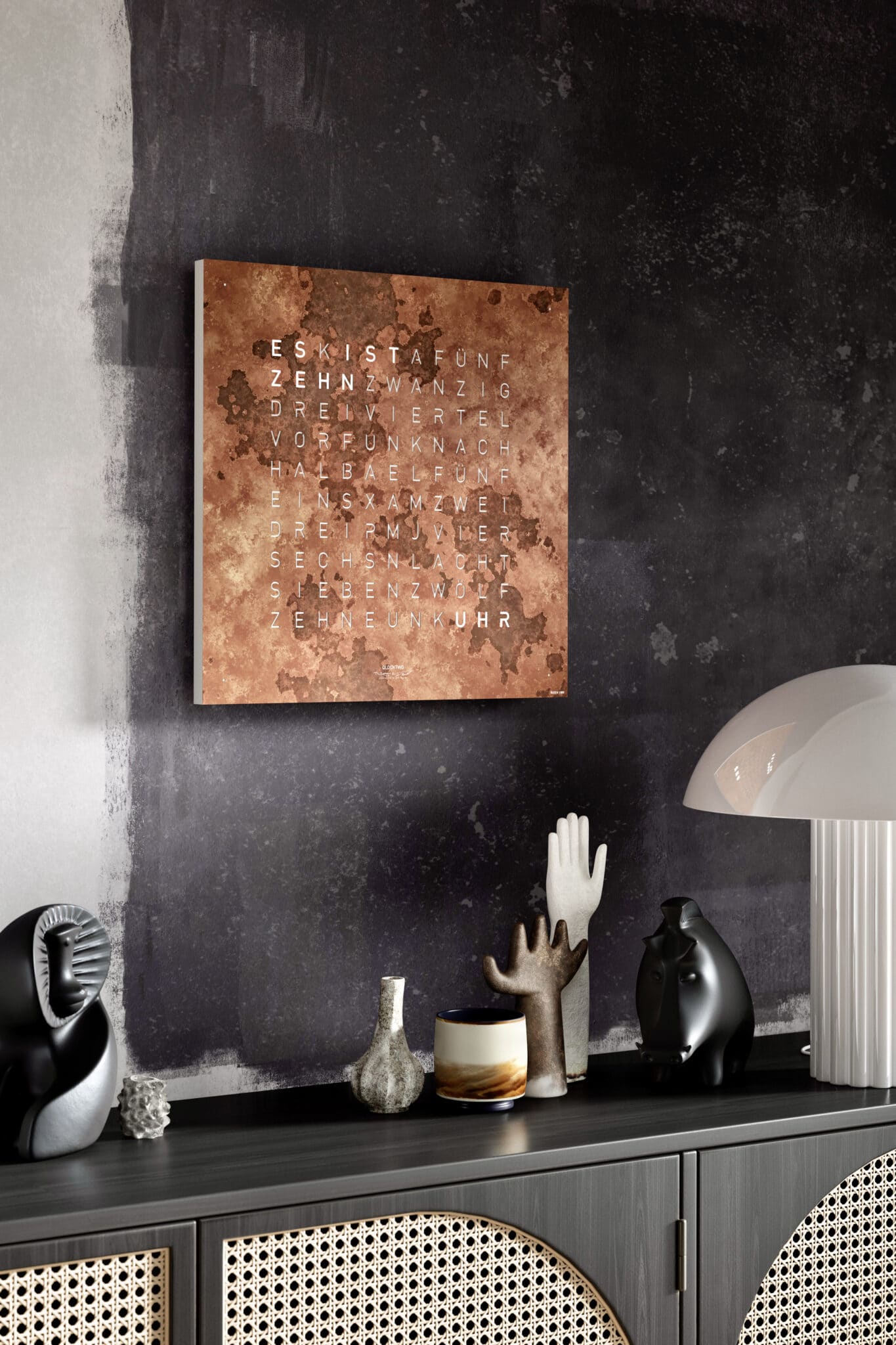 Wanduhren-Design in Vintage Copper, präsentiert in einem modernen Wohnzimmer mit Sofa und Tisch.