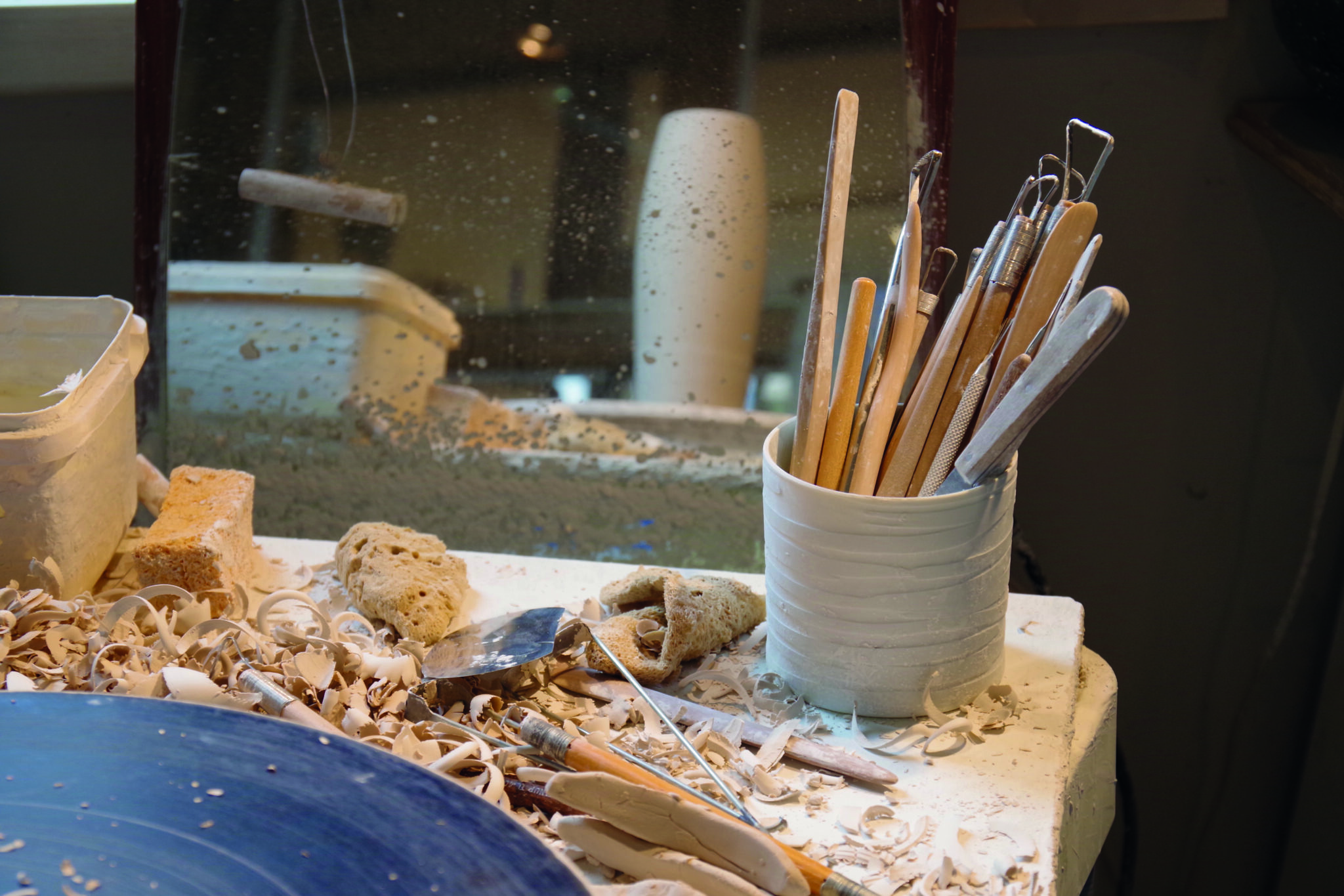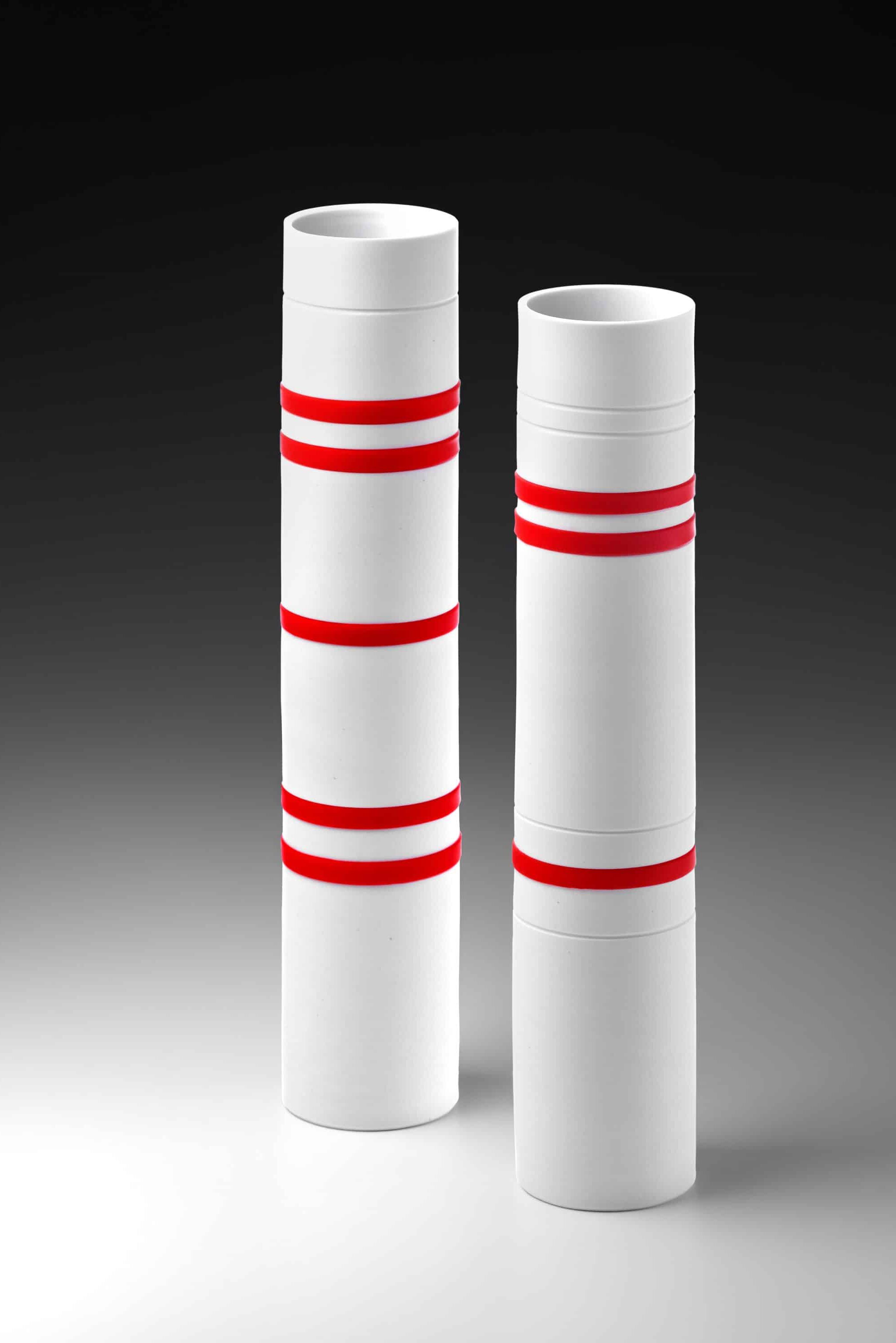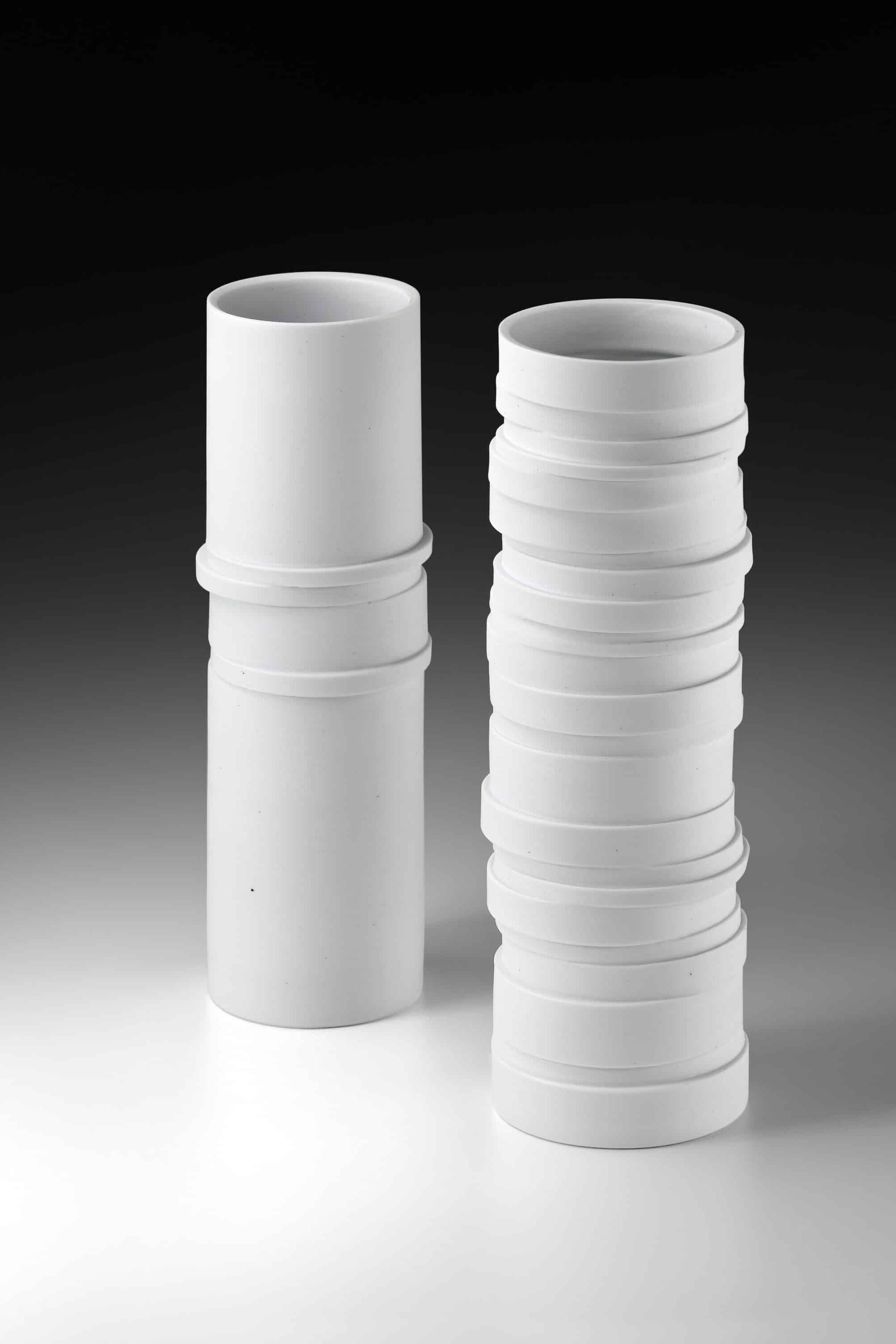 Klare Linien, feine Strukturen, zarte Farbkontraste zeichnen die individuell gestalteten Porzellangefäße von Roswitha Winde-Pauls aus.