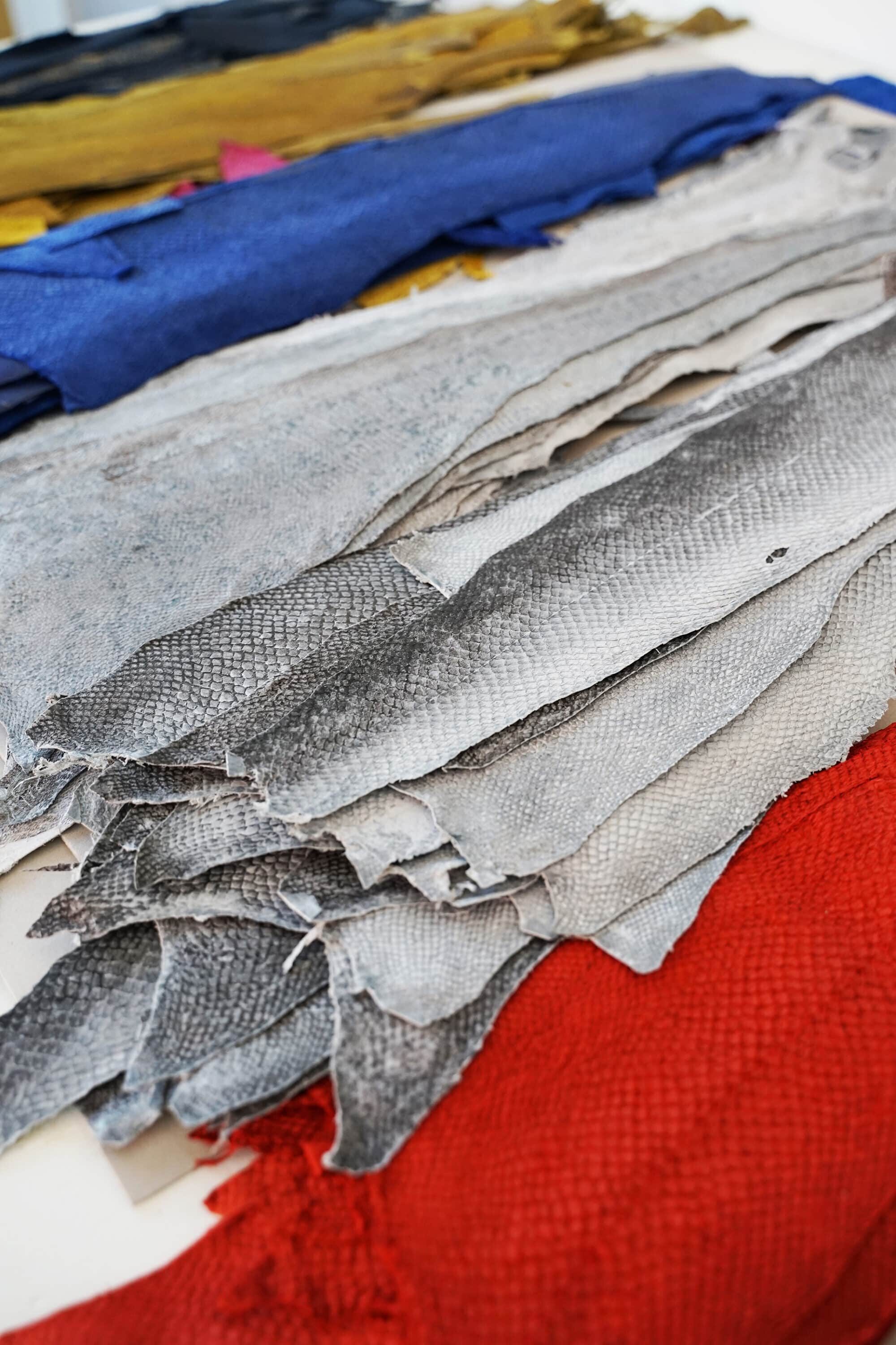 Dort lernte sie Fischleder kennen und lässt sich bis heute von dessen Ästhetik zu immer wieder neuen Kreationen inspirieren: Fischleder hat durch die oft deutlich sichtbaren Schuppentaschen eine besondere Struktur, es riecht nicht, ist leicht und geschmeidig wie Seide und, was man nicht gleich vermutet, aufgrund seiner gekreuzten Faserstruktur auch sehr widerstandsfähig. Belässt die isländische Gerberei die fischeigene Pigmentierung in der Haut, ergibt sich mit dem Einfärben mal ein ruhiges, mal ein aufgeregt schimmerndes Farbspiel. Das smaragdgrüne Leder vom gefleckten Seewolf und das blaugraue Leder vom Dorsch zeigen diesen malerischen Effekt besonders deutlich.