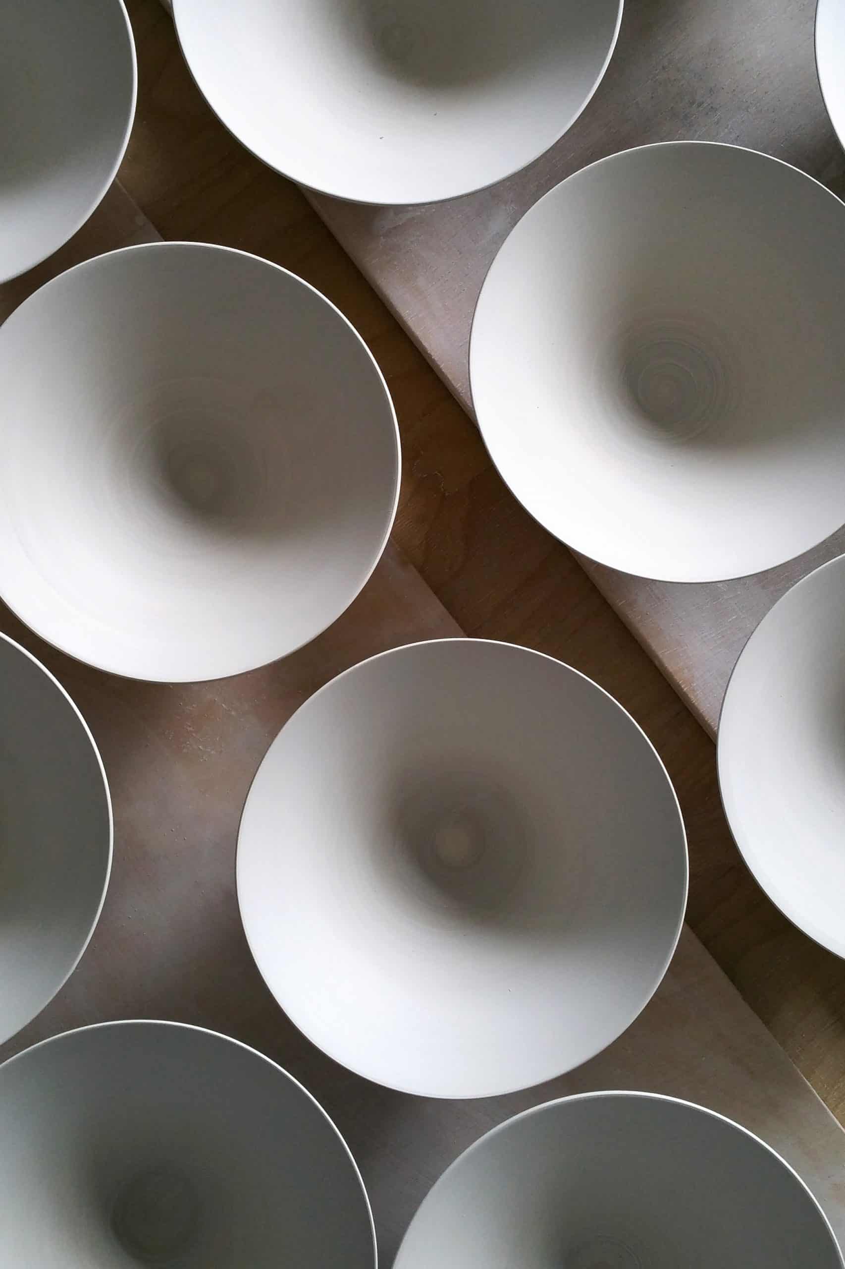 Claudia Schoemigs Arbeiten zeichnen sich durch ein tiefes Gespür für die besondere Materialität von Porzellan aus. Das Erscheinungsbild ihrer Stücke ist klar und reduziert, zugleich strahlen sie eine große Sinnlichkeit aus. Als Bildende Künstlerin und Keramikerin überträgt sie besondere Entwürfe mit ihrem Team in eine Ausführung von höchster handwerklicher Perfektion.