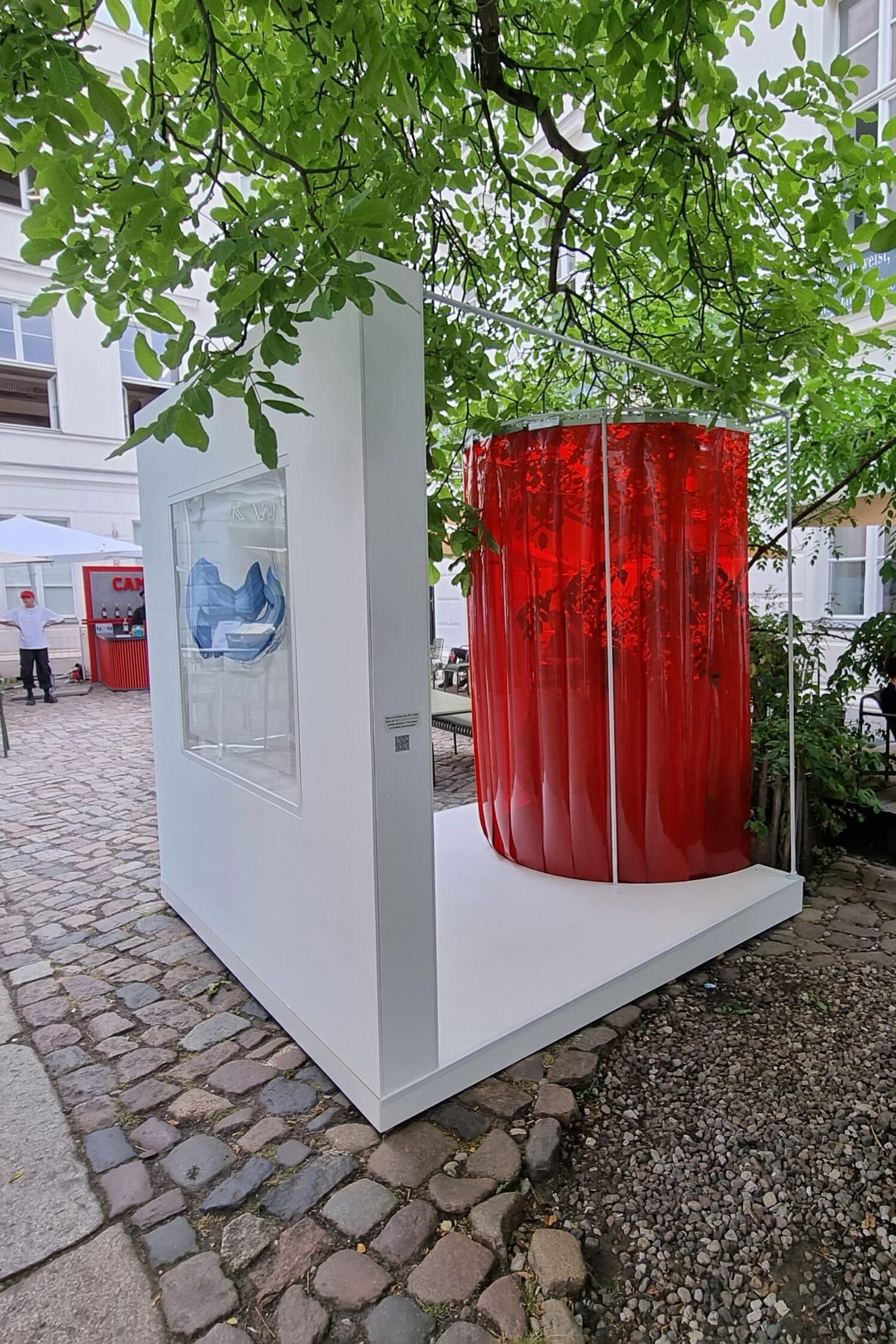Moderne, transparente Architektur mit roten Wänden, einem weißen Sitzbereich und einem begrünten Außenbereich.