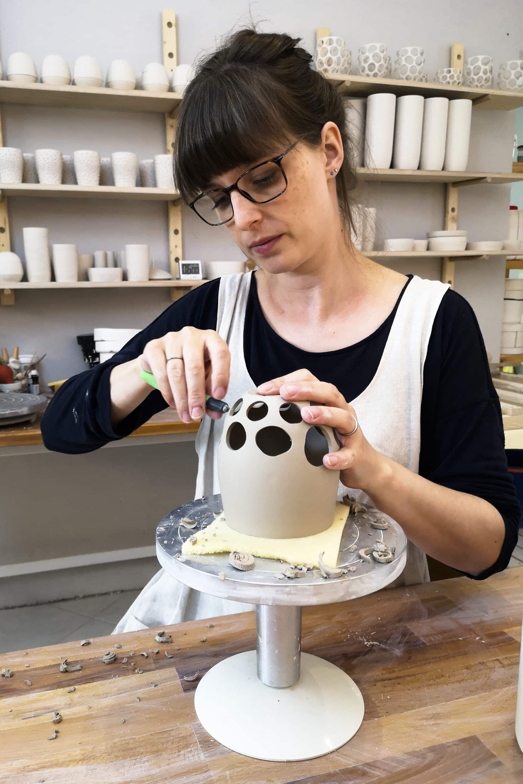So ähnlich sich die Gefäße nach dem Gießen sehen, bekommen sie, jedes von Hand bearbeitet, ihr individuelles Gesicht. Besondere Akzente setzt Andrea Degene mittels Intarsientechnik mit eingefärbter Masse, farbigen Glasuren oder einem edlen Golddekor. Während die “Bubblebecher” mit farbigen Masseperlen besetzt werden, halten nur noch dünne Stege die Teelichter in ihrer eigentlichen Form zusammen. Ganz nach dem Motto: Loch an Loch – und hält doch.