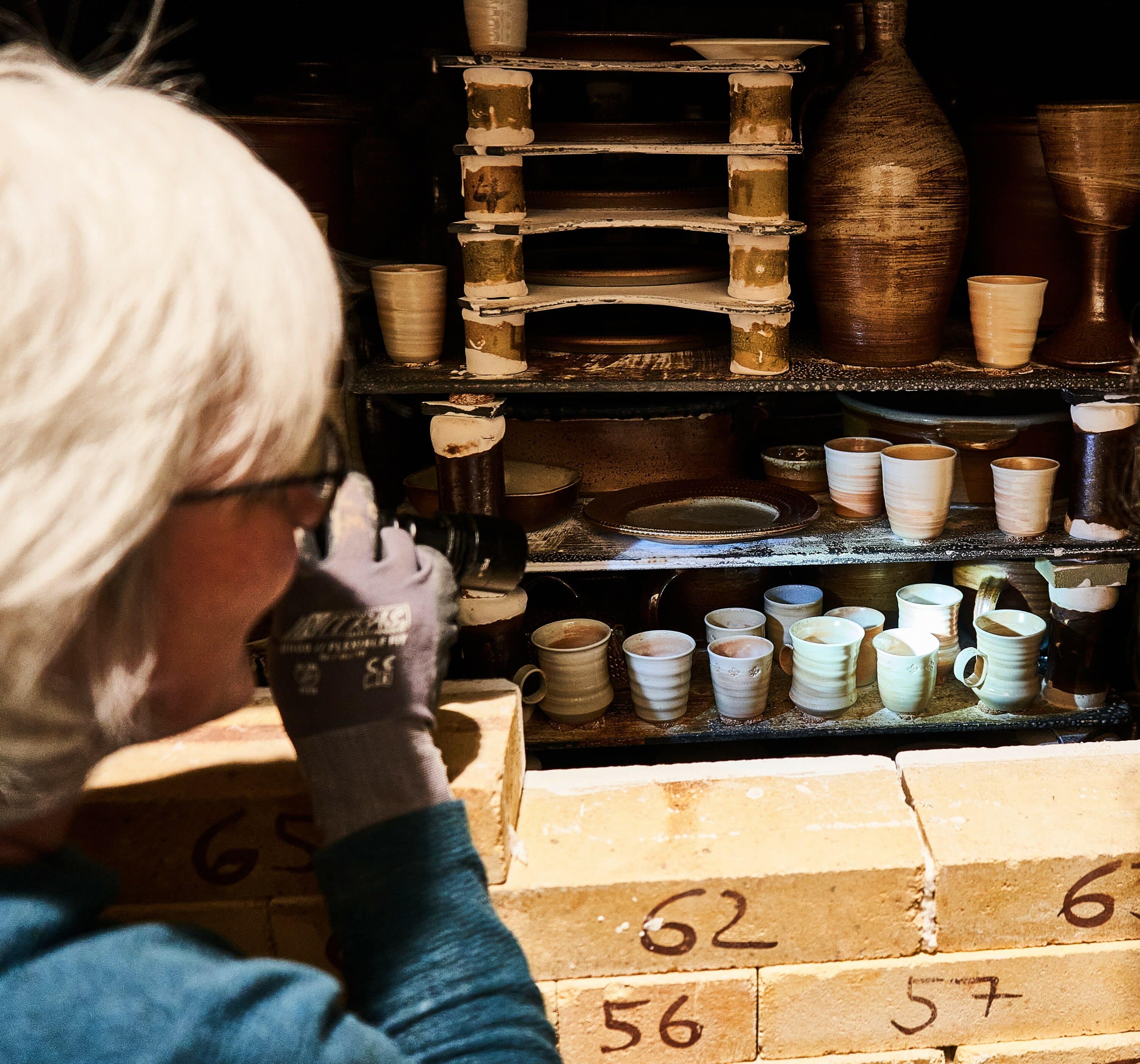 Porzellan-Teekanne in einem Holzbrandofen, umgeben von weiteren Töpferwaren und Keramiken.
