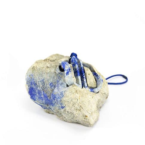 Collier aus transparentem Material und blauer Schnur, schwebend über einem grauen, steinartigen Untergrund.