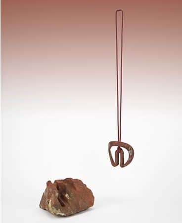 Frau in rotem Oberteil steht neben einer skulpturalen Säule mit blauer Basis und grauem Kopfstück vor einer weißen Wand.