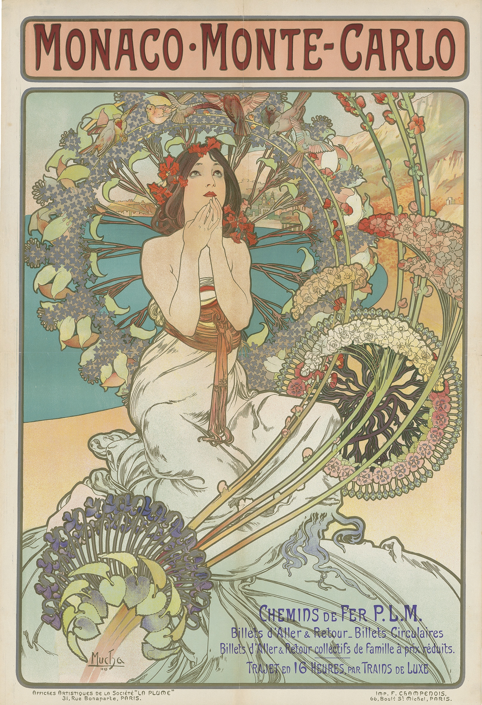 „Monaco Monte Carlo“ – Dieses seltene Beispiel für Alphons Muchas romantisches Flair und seine Liebe zum Detail lädt zu Reisen nach Monaco und Monte-Carlo ein. Die künstlerische Freiheit, die sich Muchas zum Zeitpunkt der Entstehung dieses Werkes bereits errungen hatte, spiegelt sich in der Gestaltung des Plakats wieder: Während die Frau im Vordergrund prunkvoll geschmückt den Hauptteil des Bildes einnimmt, werden Meer und Strand – reduziert auf ihre Elementarmerkmale – zur Nebensache.