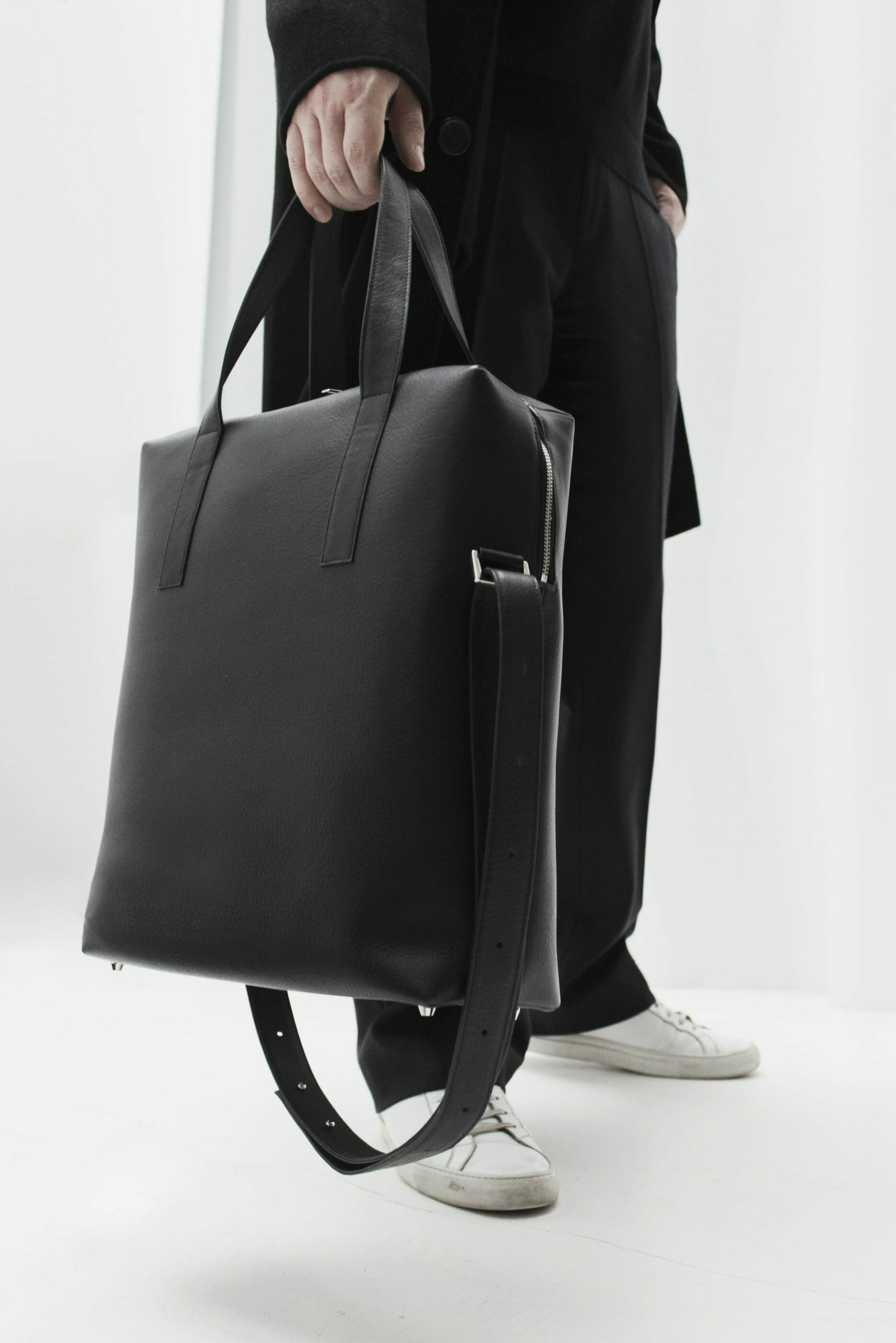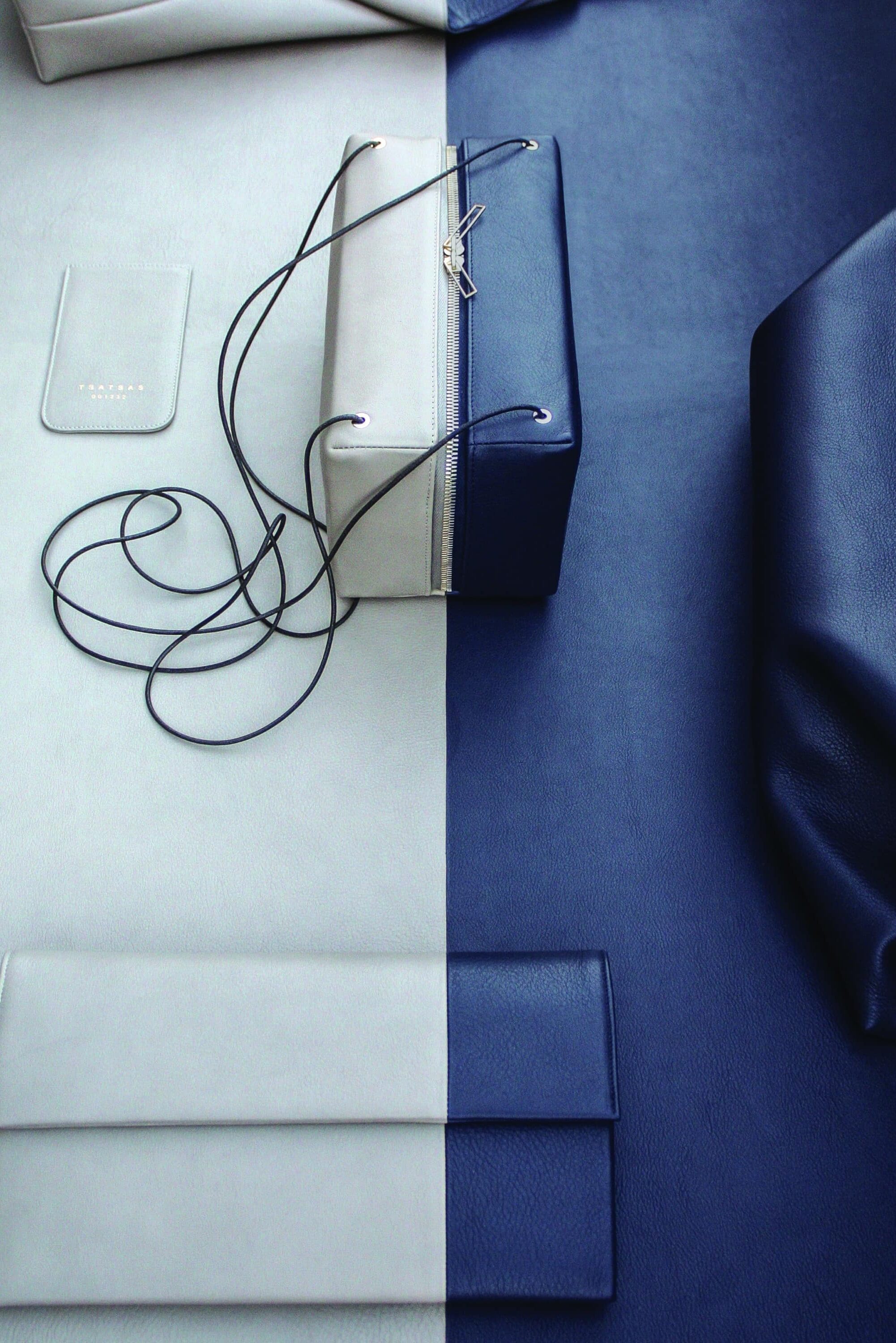 Ich bin selbst Architektin, mein Mann Dimitrios ist Industriedesigner. Er ist in der Manufaktur seines Vaters mit dem Lederhandwerk groß geworden und kennt fast jeden Handgriff. Wir kombinieren also Elemente und Prozesse aus Architektur und Design mit dem klassischen Handwerk. Diesen Prozess findet man im Accessoire-Bereich doch eher selten. Wenn du dir einmal Taschenmodelle anschaust, gibt es weltweit vielleicht zehn klassische Formen, die verarbeitet werden. Dann spielt man mit Farben und Dekorationen, hier und da eine schöne Schnalle, aber es bleibt immer derselbe Taschenentwurf. Wir versuchen hingegen, nicht in diesem klassischen Handtaschenmuster zu denken, und sehen die Tasche als Produkt, bei dem wir die Einzelteile de- und rekonstruieren.