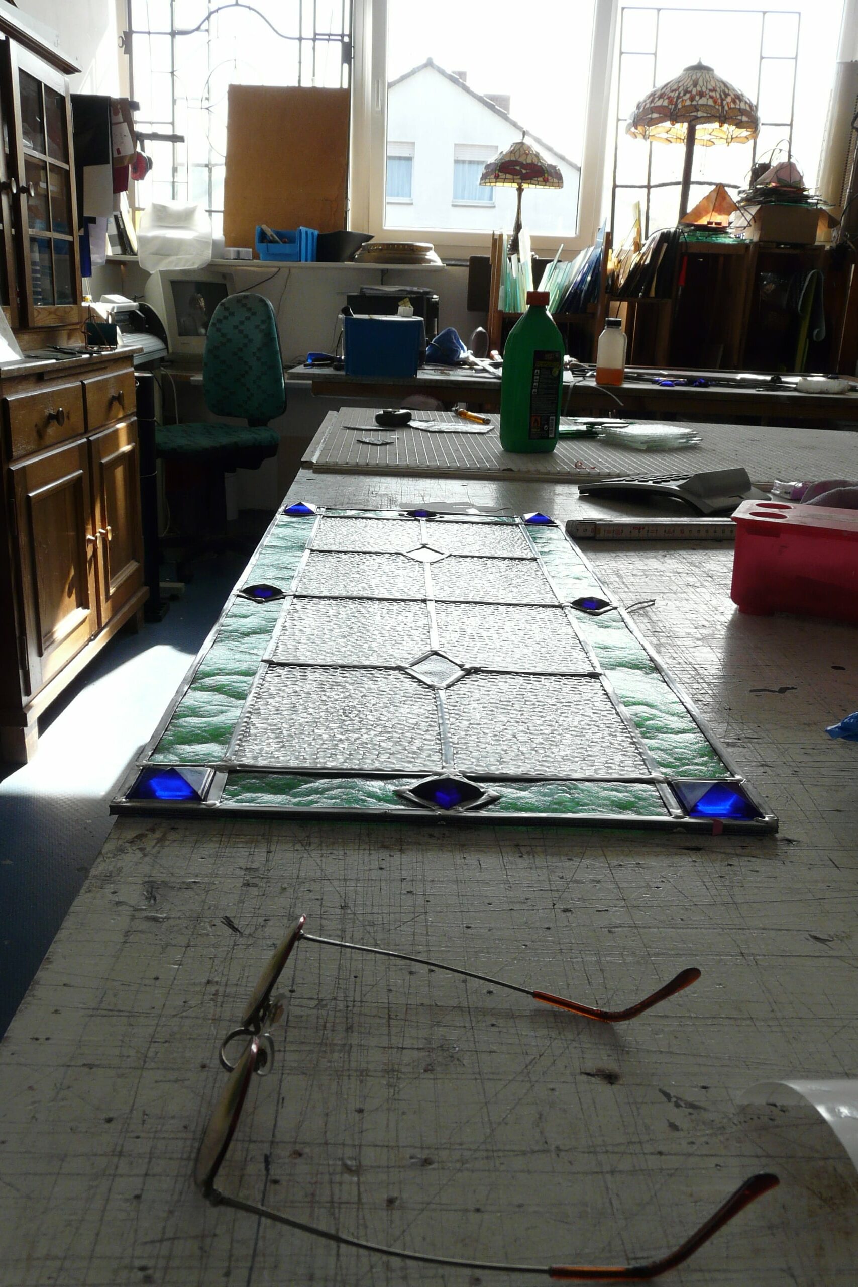 Im Laufe der Jahre ist durch das Sammeln und Aufbewahren von alten Scheiben ein umfangreiches Lager mit historischen Gläsern entstanden, das den beiden die Möglichkeit gibt, kaputte, alte Bleiverglasungen in Struktur und Farbe originalgetreu zu reparieren oder eine historische Vorlage exakt nachzufertigen.