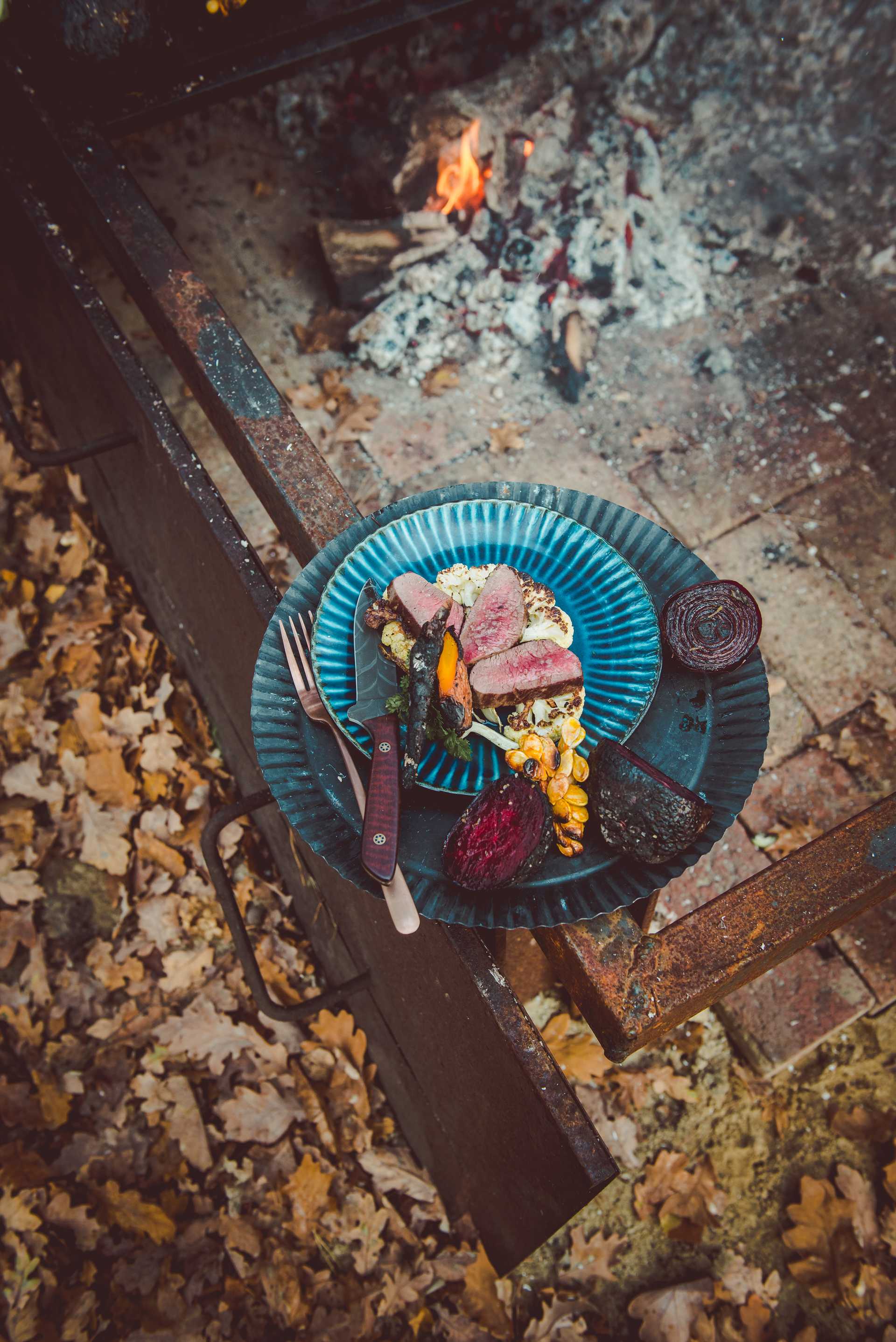 Flach und länglich geformt, ruht der Stahl in kalter Asche, die Teilnehmer sitzen auf Stühlen. Nicht weil es körperlich anstrengend ist, sondern weil jeder Schritt absolute Konzentration erfordert. Das ist eine andere Form, den Alltag hinter sich zu lassen, eine meditative fast. Alle Sinne sind geschärft, auch beim nächsten Schritt: Schutzbrille, Handschuhe und Gehörschutz sind Pflicht, wenn das flache Metallstück mit dem Winkelschleifer erst gesäubert und dann zerschnitten wird. Groß, schwer und kraftvoll frisst sich die Trennscheibe funkensprühend durch den Stahl. Vier gleich große Teile entstehen, die aufeinandergelegt und zu einem Block verschweißt werden – insgesamt 40 Lagen.