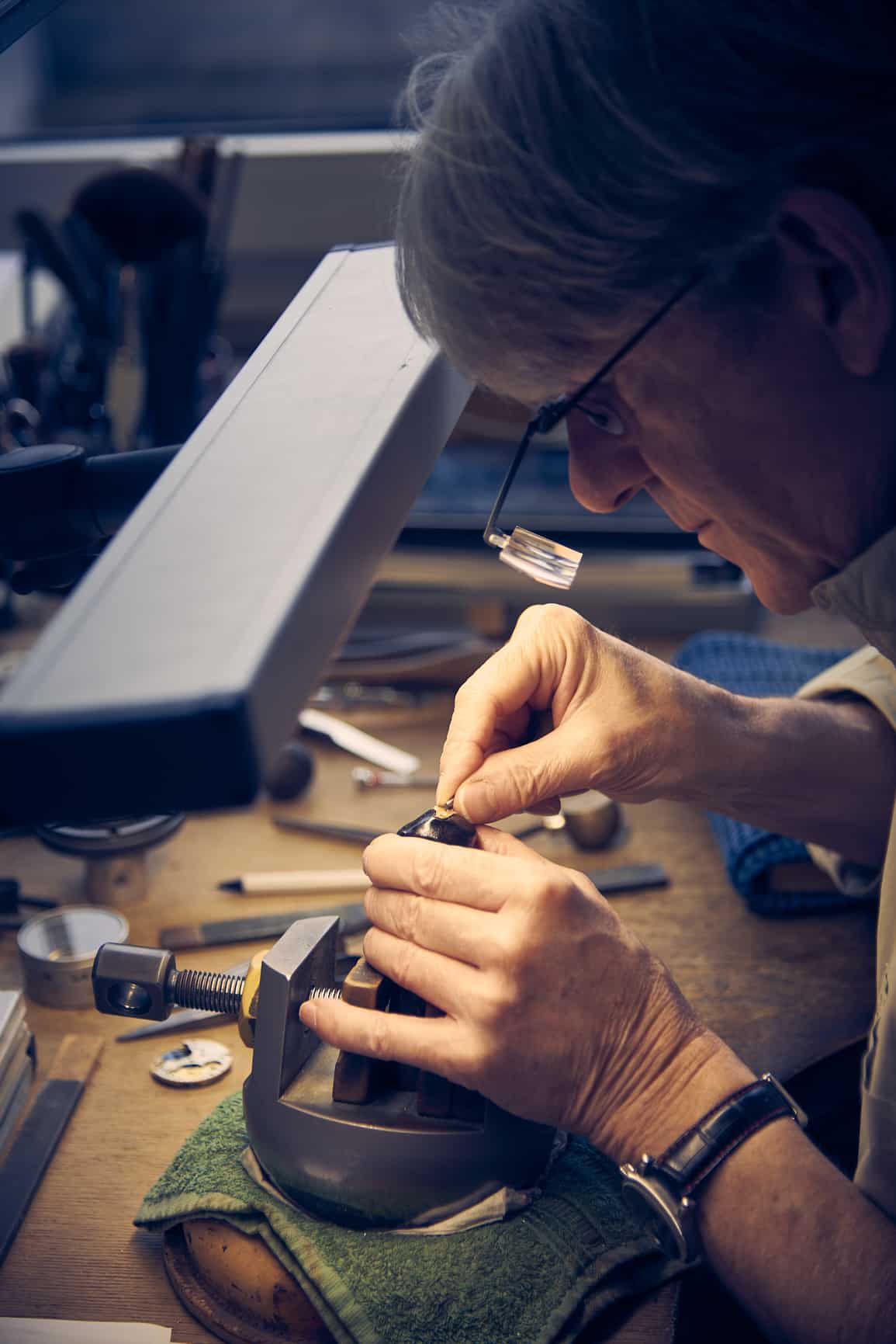 In seinem Pforzheimer Atelier entstehen jährlich circa 100 Unikate, die sich nicht nur durch die einzigartige Kombination traditioneller Handwerkstechniken, unterschiedlicher Vergoldung und handgebläuten Schrauben und Zeigern auszeichnen, sondern auch durch eigene technische Umbauten: Regulatoren, Subskriptionen oder 24-Stunden-Anzeigen sind zusätzliche Raffinessen. Dabei ist diese Kombination aus traditioneller Handwerkskunst und hauseigenen technischen Umbauten weltweit einzigartig.